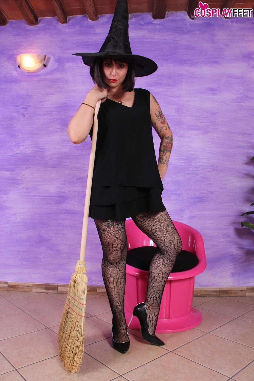 纹身黑发Ammalia在万圣节连裤袜中展示她的脚底