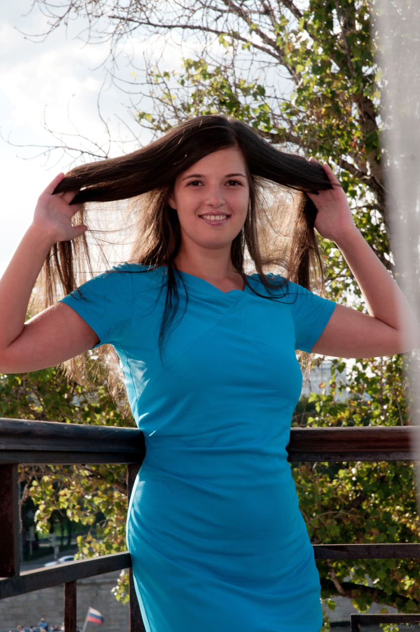 Natalya A 炫耀她剃光的少女阴道,大阴蒂和完美的臀部,在户外情色裸美色情图片中——特写臀部张开,大阴道挑逗,白色连衣裙脱去。