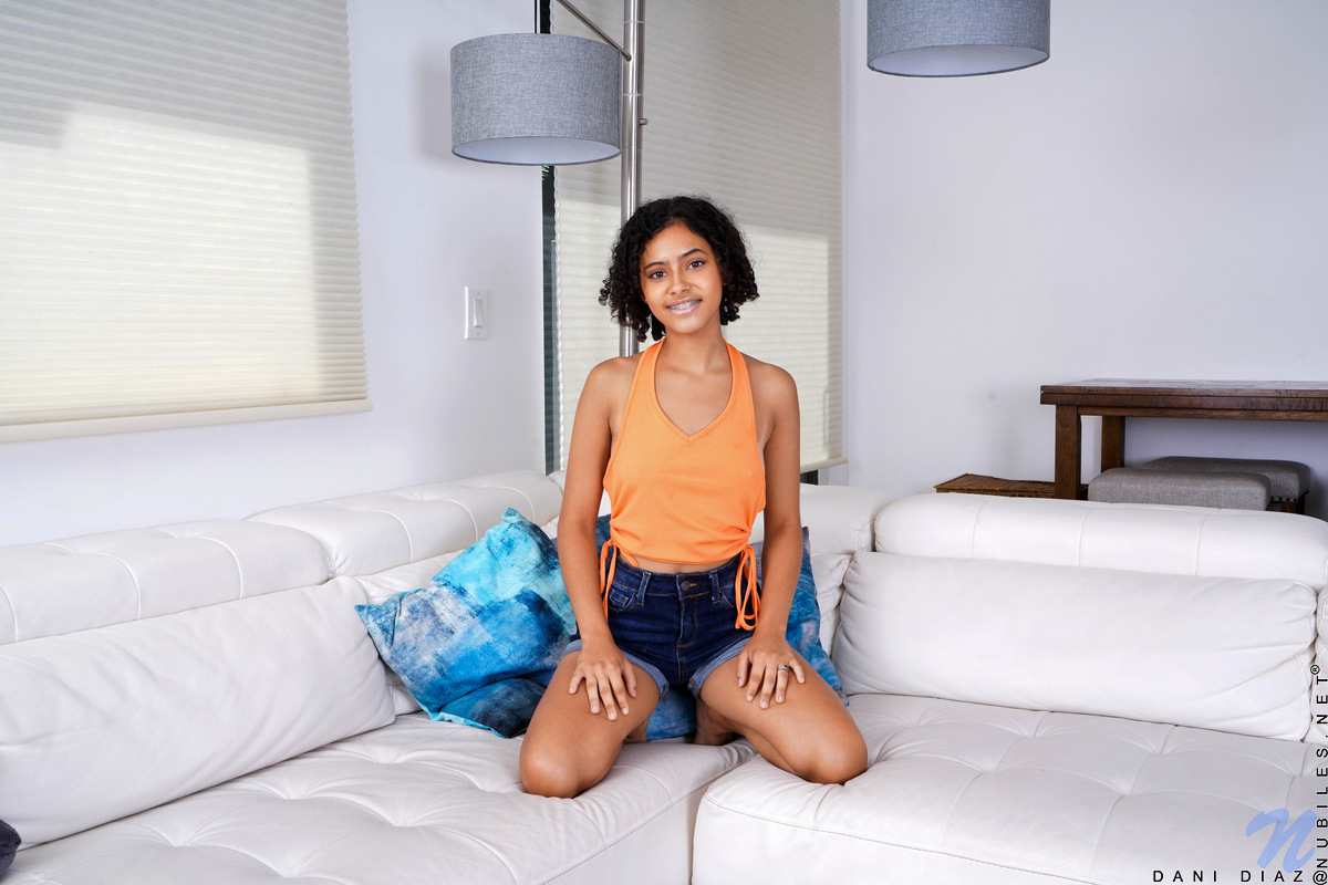 可爱的浅肤色混血少女 Dani Diaz 在沙发上张开双腿,露出小牙套、晒痕身材和紧致的肛穴;一位腿部性感、非洲小乳房、眼神美丽的黑人女孩独自表演。
