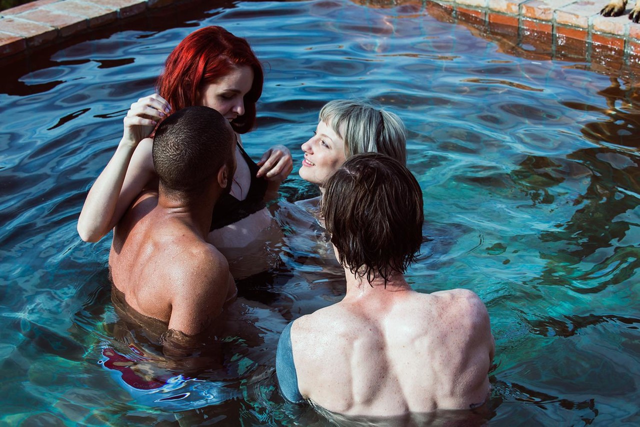 泳池四人行激烈性爱 与女友们阿马尔纳·米勒和维克斯·阿什莉 - 图库信息