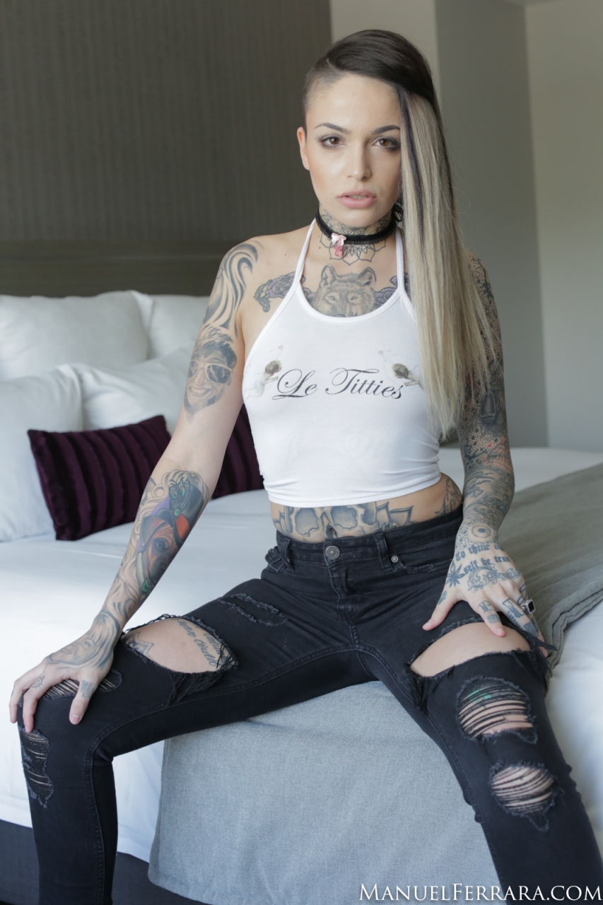 纹身Leigh Raven戴黑色项圈脱衣全裸 - 图库信息