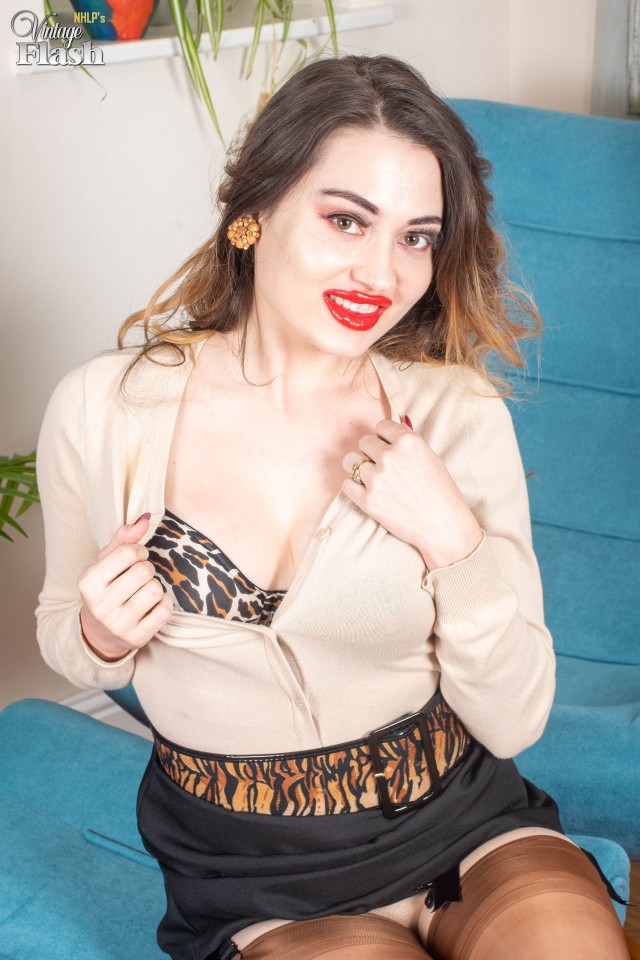 加布里埃拉骑士(Gabriella Knight)在复古尼龙袜和吊带中挑逗,分开剃光阴道,闪现大奶子,在内衣、高跟鞋和裙子中。