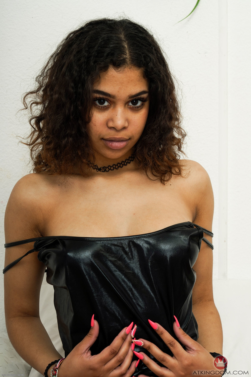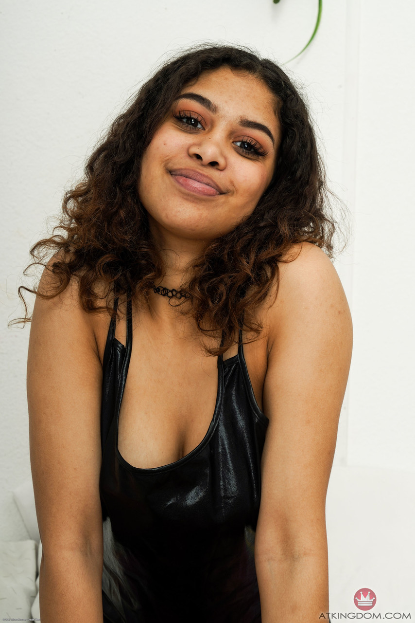 性感的黑发美女Jeni Angel裸体,近距离展示她的剃光阴道,在一个独奏的特写中,突出了她小巧的黑美人身体。