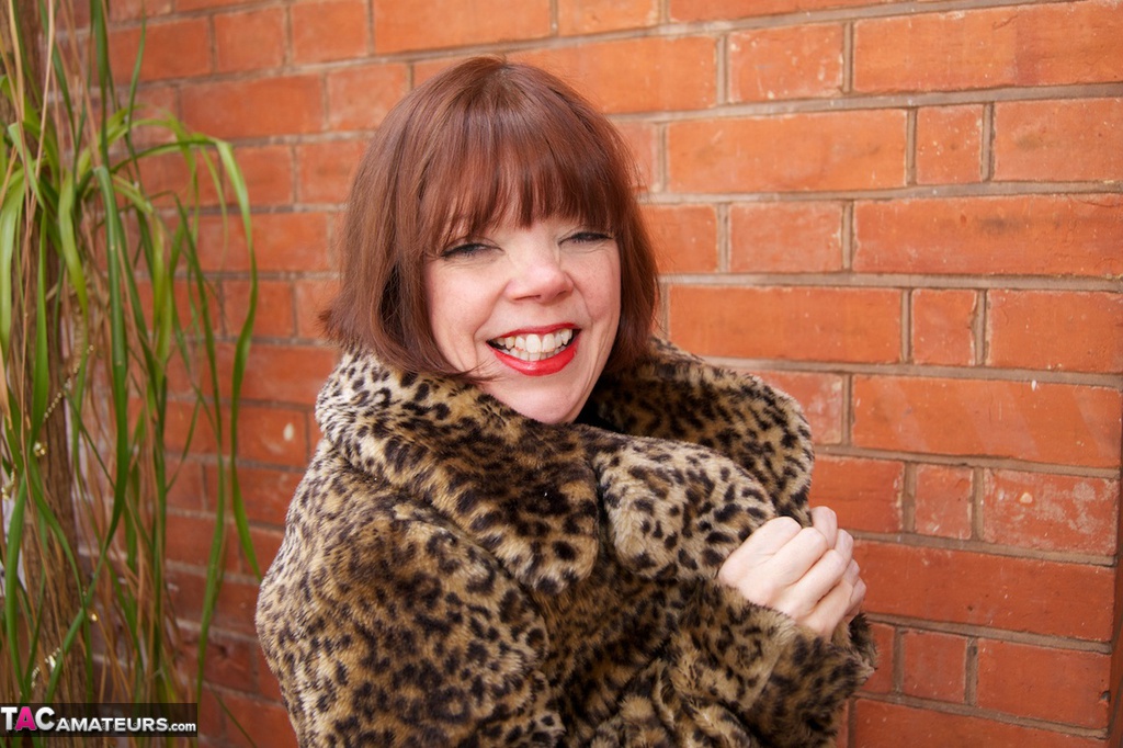 一位红发的熟女,穿着豹纹大衣和黑色丝袜,在户外展示她剃光的成熟私处,为50岁以上的扁胸红发的PAWG爱好者们张开双腿。