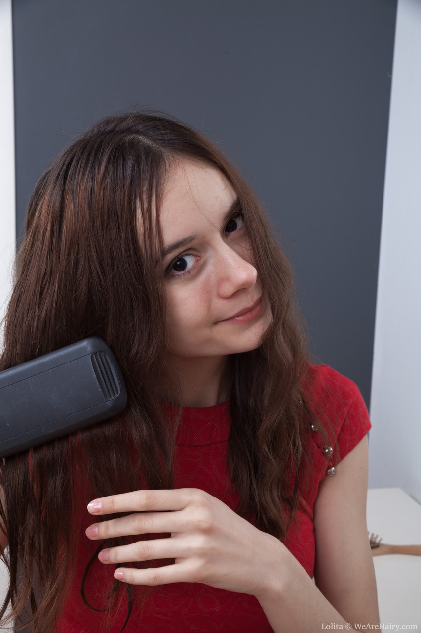 毛茸茸的穴黑髮蘿莉脫光並梳理