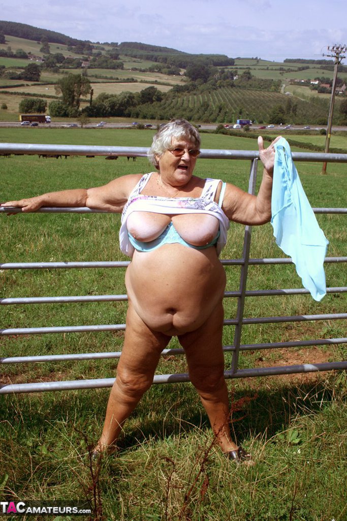 英国奶奶莉比在家畜田旁暴露自己 - 图库信息