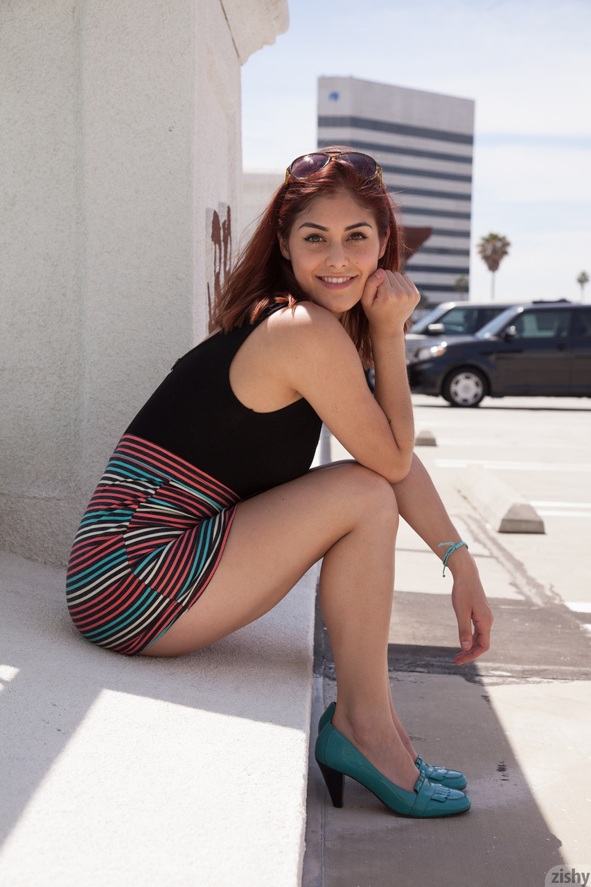 业余火辣红发女郎Helena De穿夏装挑逗,公开撩裙露蕾丝内裤,在户外车展弯腰,美艳红发美女。