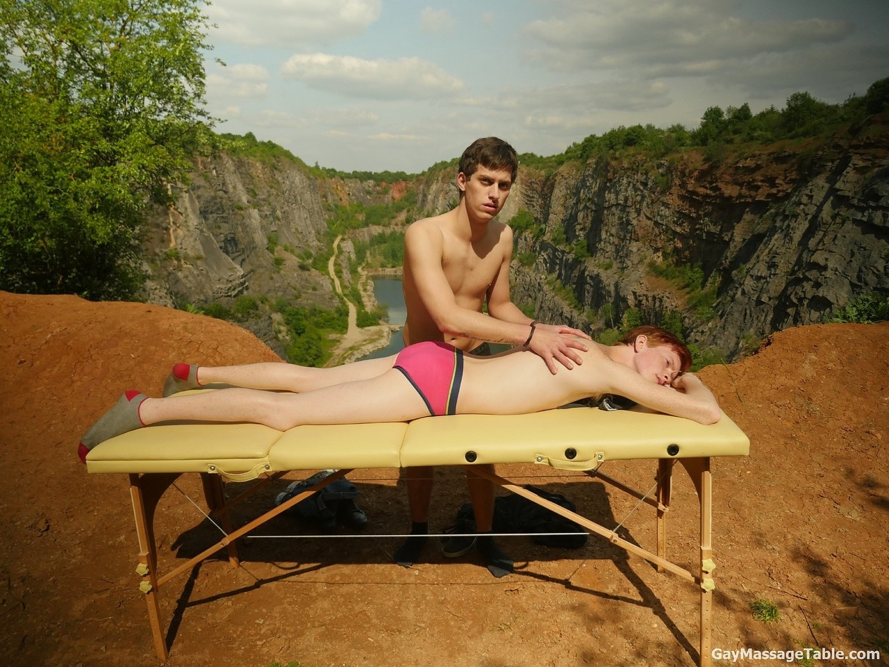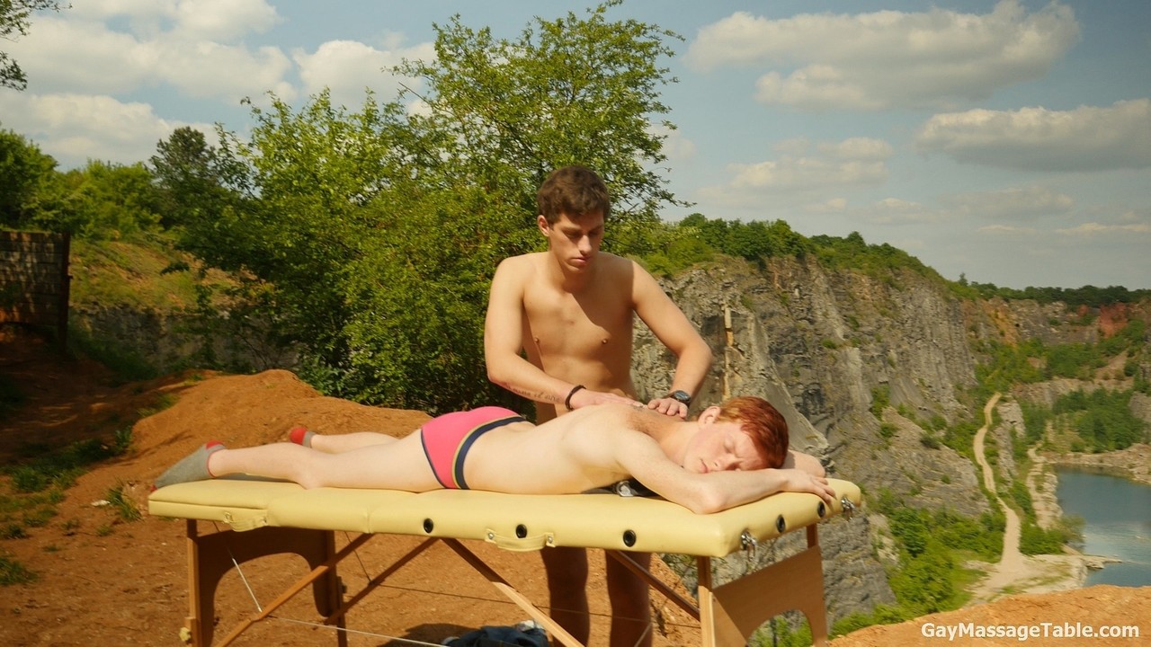 可爱的同性恋者伊利亚·杨和瑞恩·奥尔森在户外按摩床上分享激情的亲吻和无套性行为,带有蒸汽手交和内衣游戏