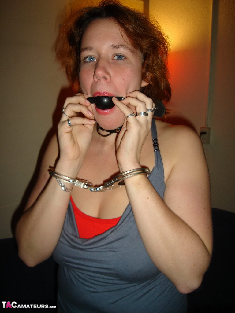 自然红发戴口球和手铐穿靴子自慰 - 图库信息