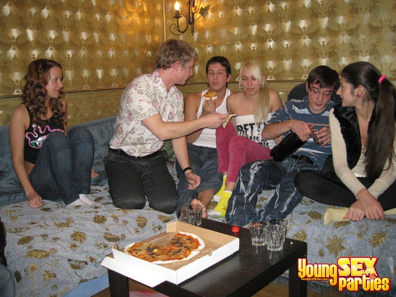 青少年披萨派对变成狂野的性派对,有年轻的女孩穿着牛仔裤骑乘式,口交和接受肛交,在群交现实中。
