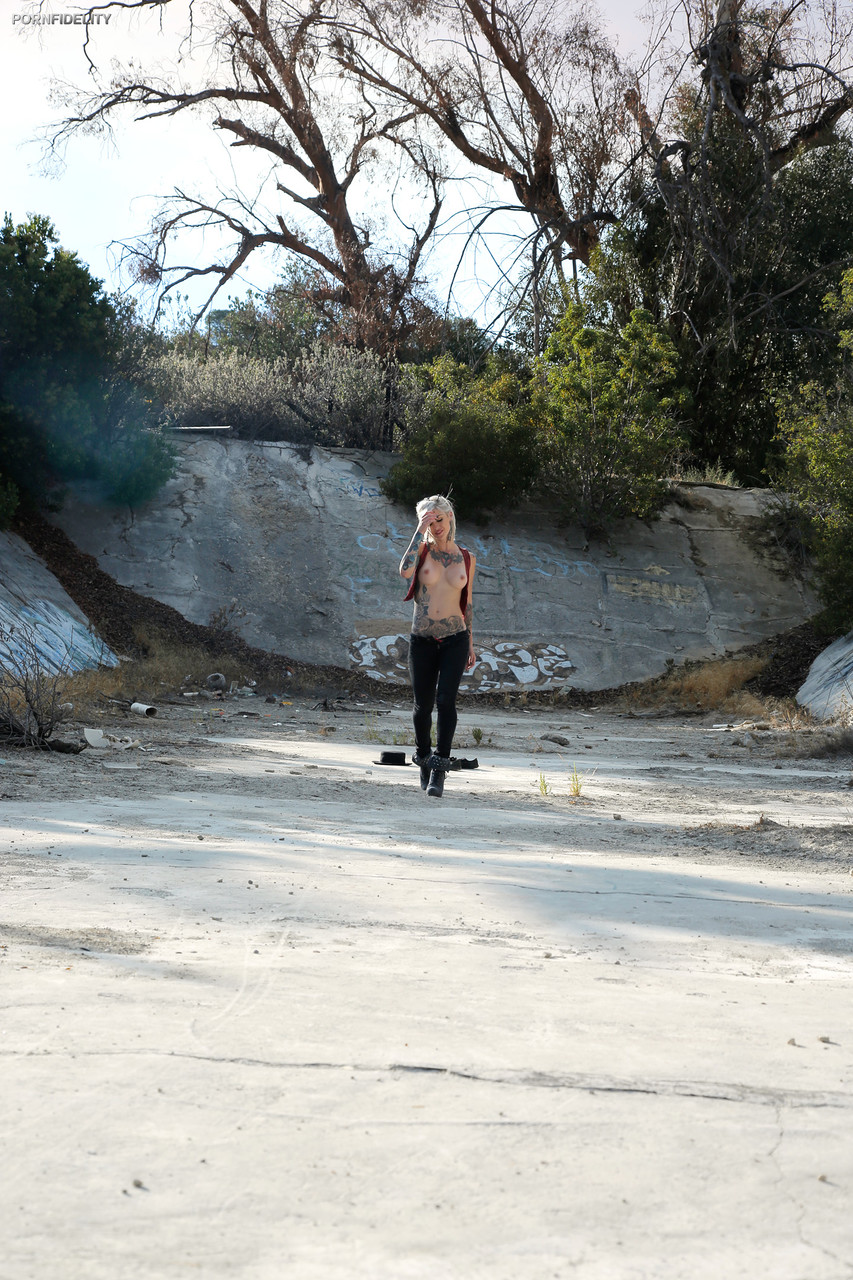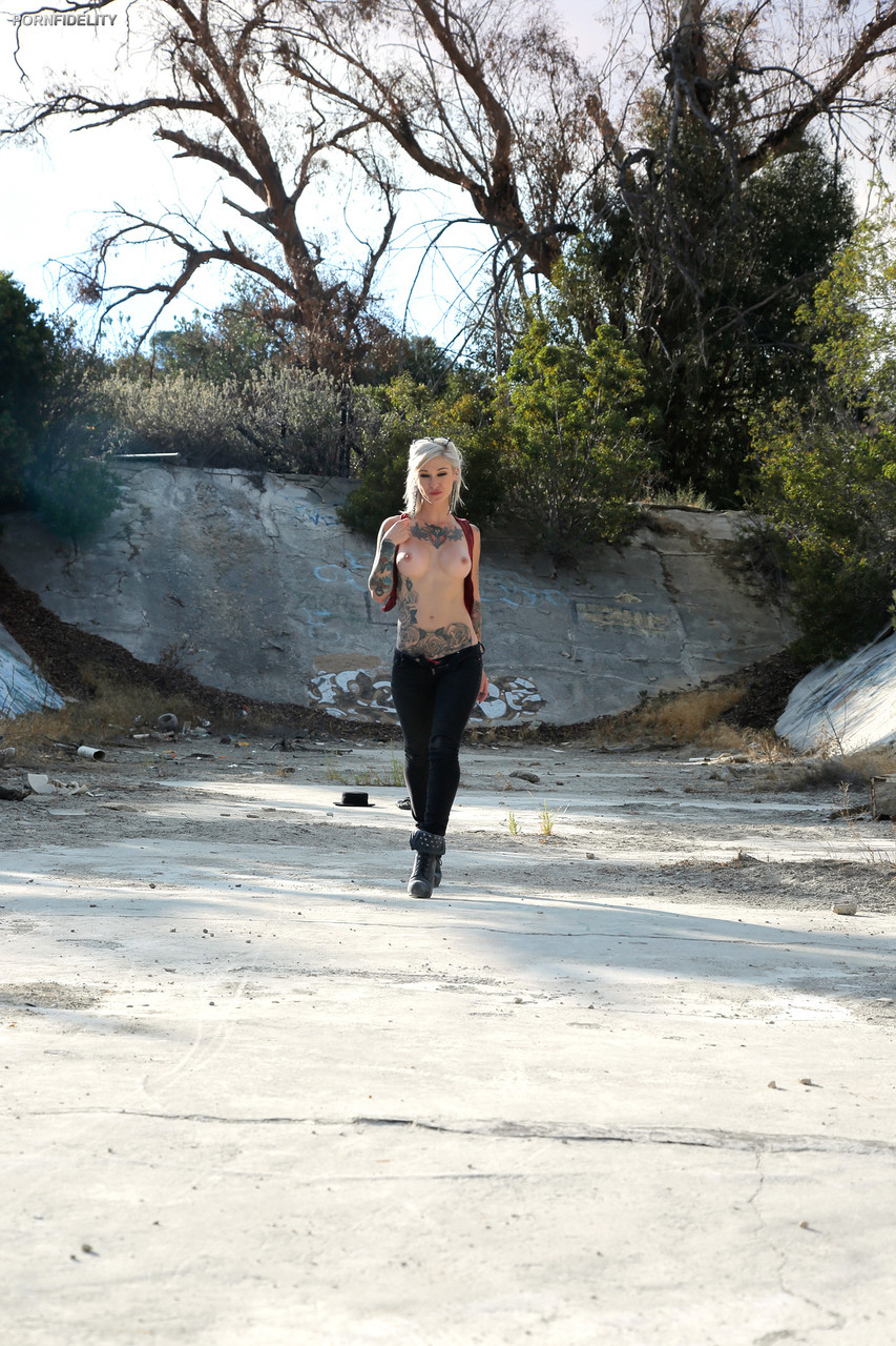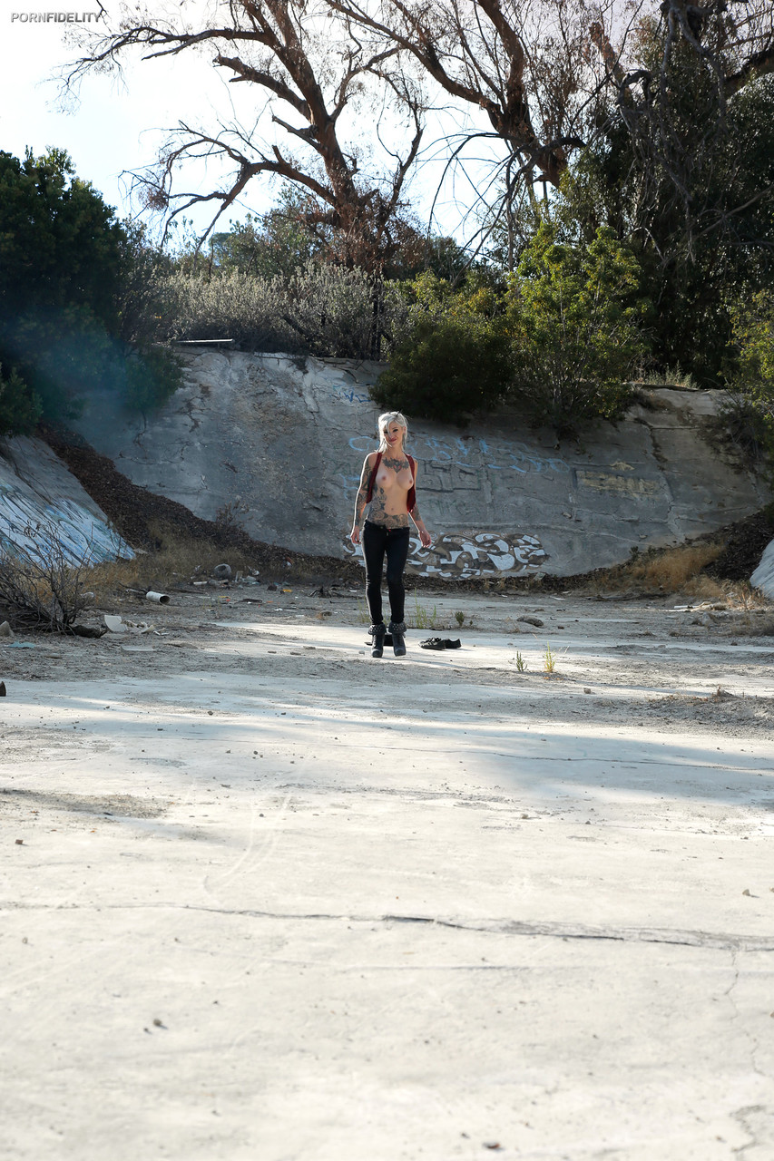巨乳纹身金发女郎Kleio Valentien在户外赤裸上身被人崇拜双脚 - 图库信息