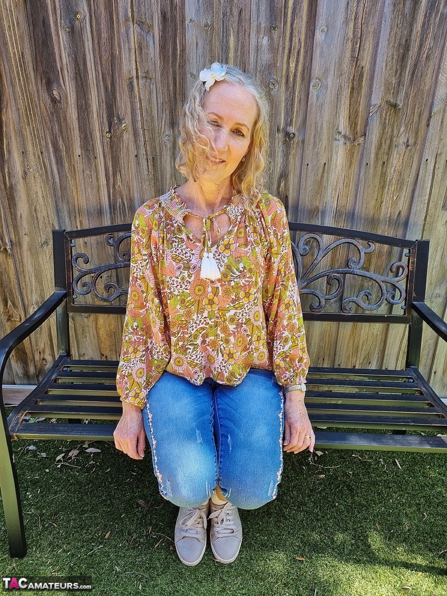 金发奶奶雅各琳裸体在毯子上展示她浓密的老阴户,在外面,穿着袜子和跑鞋,微小的乳房,业余的成熟的表演者调情。