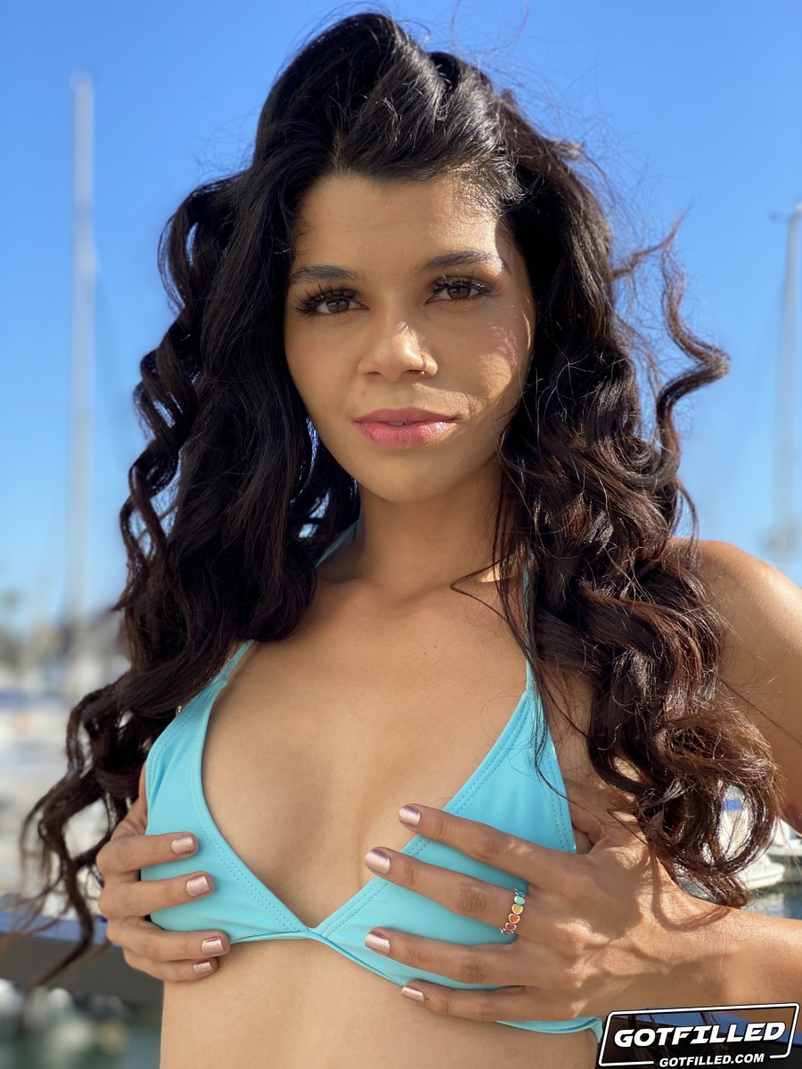 Harley Haze 穿比基尼在码头进行 POV 大屌性爱之前 - 图库信息