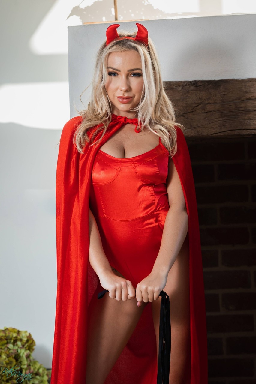 金发尤物贝丝·摩根身着红色披风挑逗,展示她纹身曲线、丰满双乳、长腿和高跟角色扮演魅力,满足魅力饥渴的粉丝。
