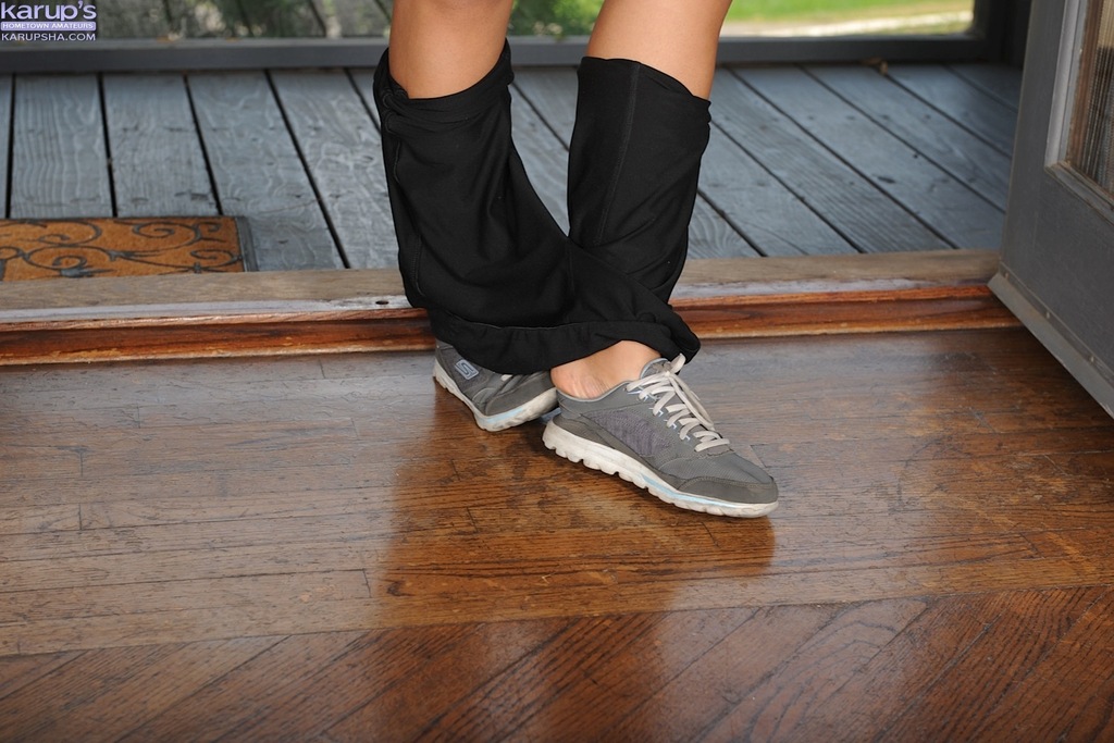 业余独舞女孩脱下氨纶裤子在露台裸体摆姿势 - 图片 3 / 16
