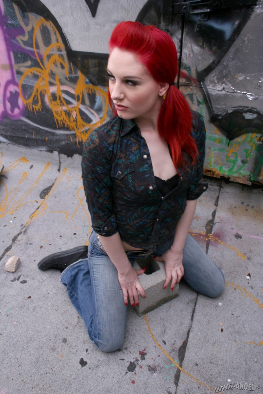 一位火辣的红辫妹在小巷中脱下紧身牛仔裤和黑色T恤,露出光滑的姜色阴部并在运动鞋中大张着双腿。