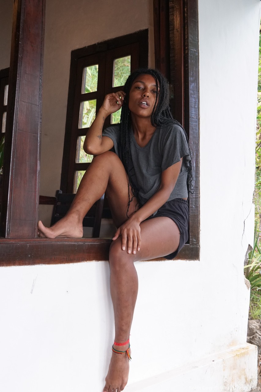 Sofia Cuty strips to flaunt huge natural tits and thick black hairy pussy, spreading wide in sexy clothed tease.