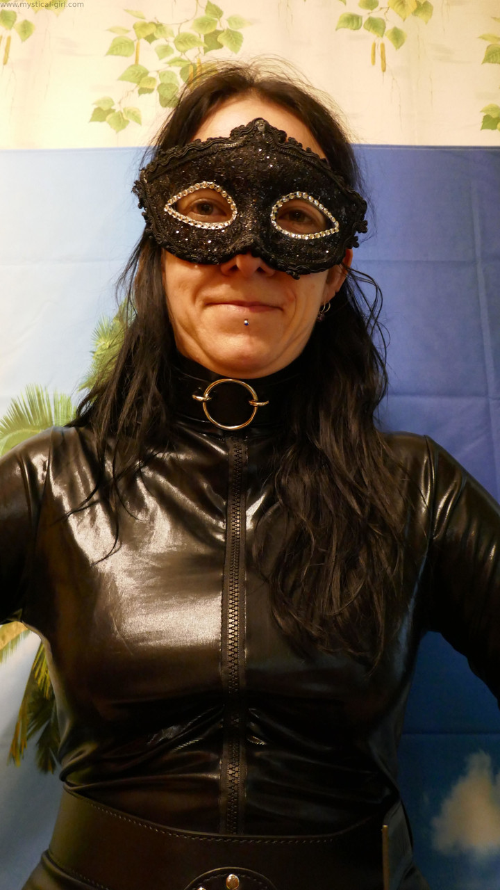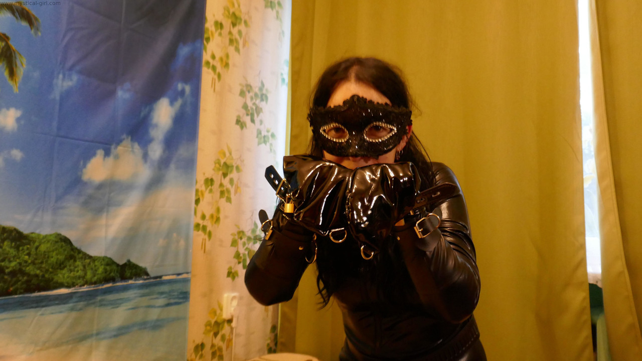 业余模特穿皮衣戴面具挣脱手铐 - 图库信息