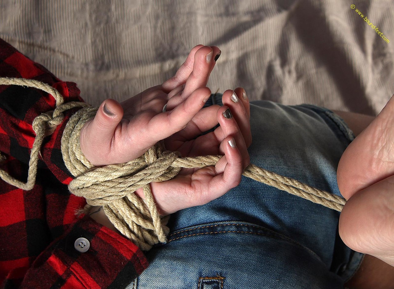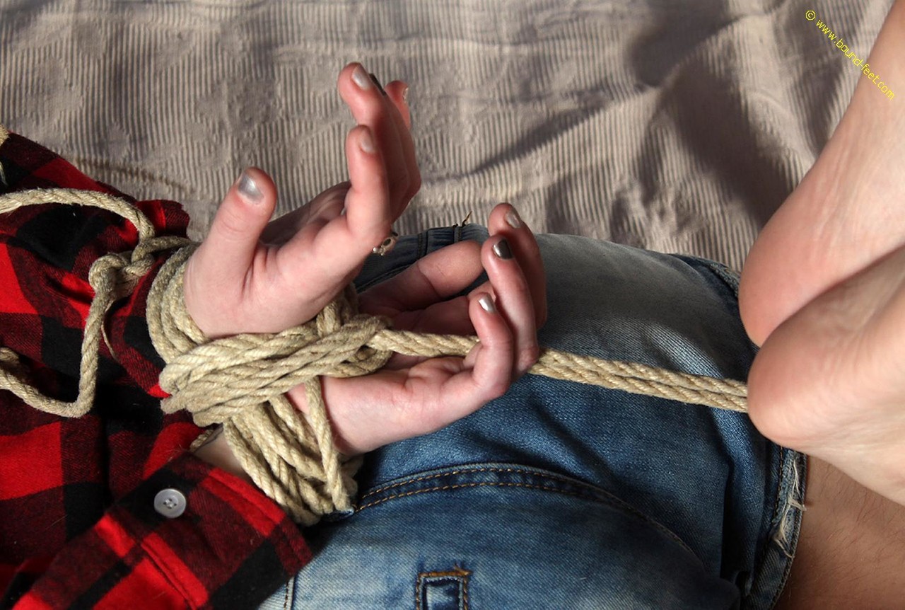 被绑住并塞住嘴的白人女孩身穿衬衫和短裤躺在床上:紧身绑缚,赤脚,服装BDSM特写挑逗
