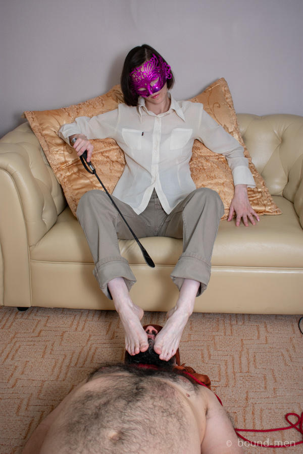 顺从的男人在女性支配游戏中崇拜白人女士的赤脚