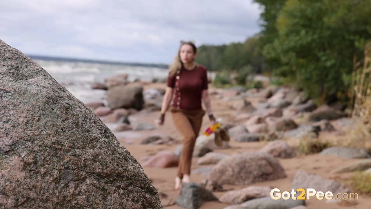 金发欧洲美女Katy Dee倚着海滩巨石紧急户外小便,性感特写 solo 尿尿场景中亮出蜜穴与菊眼。