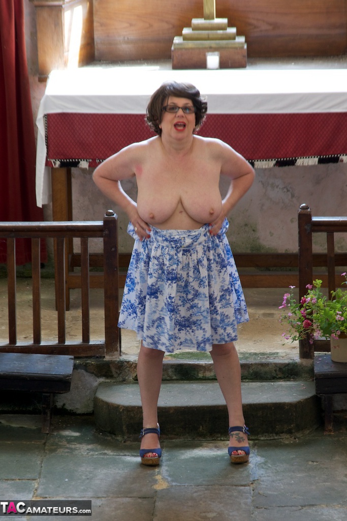 英国BBW Speedy Bee在教堂墓地脱光衣服,戴着眼镜和裙子炫耀下垂的乳房和曲线成熟身材,进行户外业余脱衣舞。
