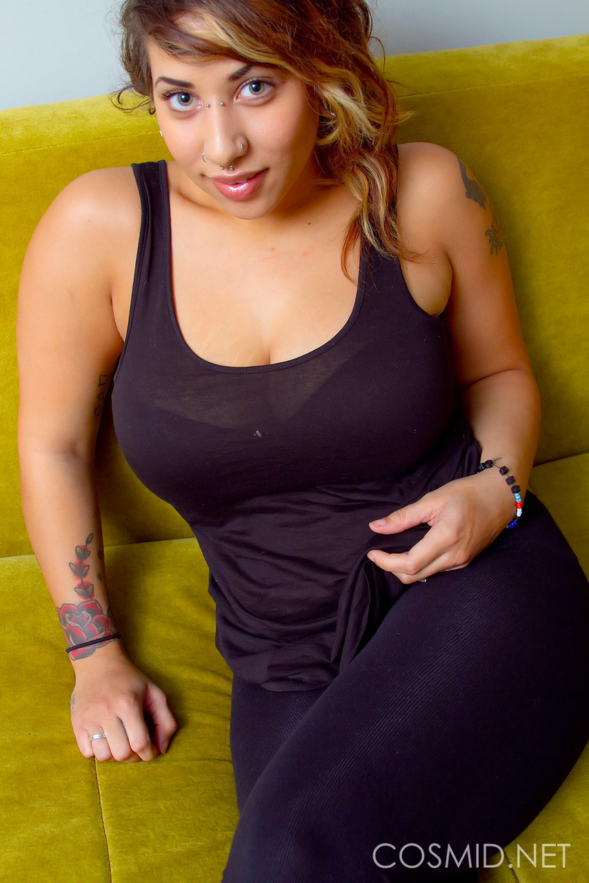 纹身的拉丁裔女性Veronika脱掉内衣,露出大大的穿孔乳头,炫耀她丰满的臀部和曲线,在业余的脱衣舞中。