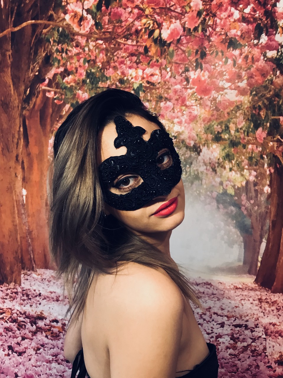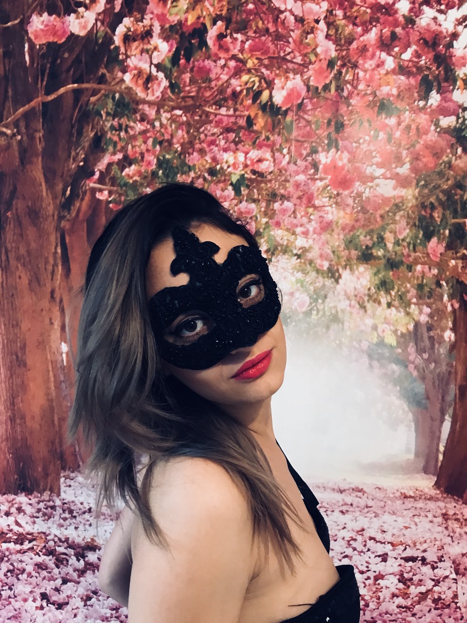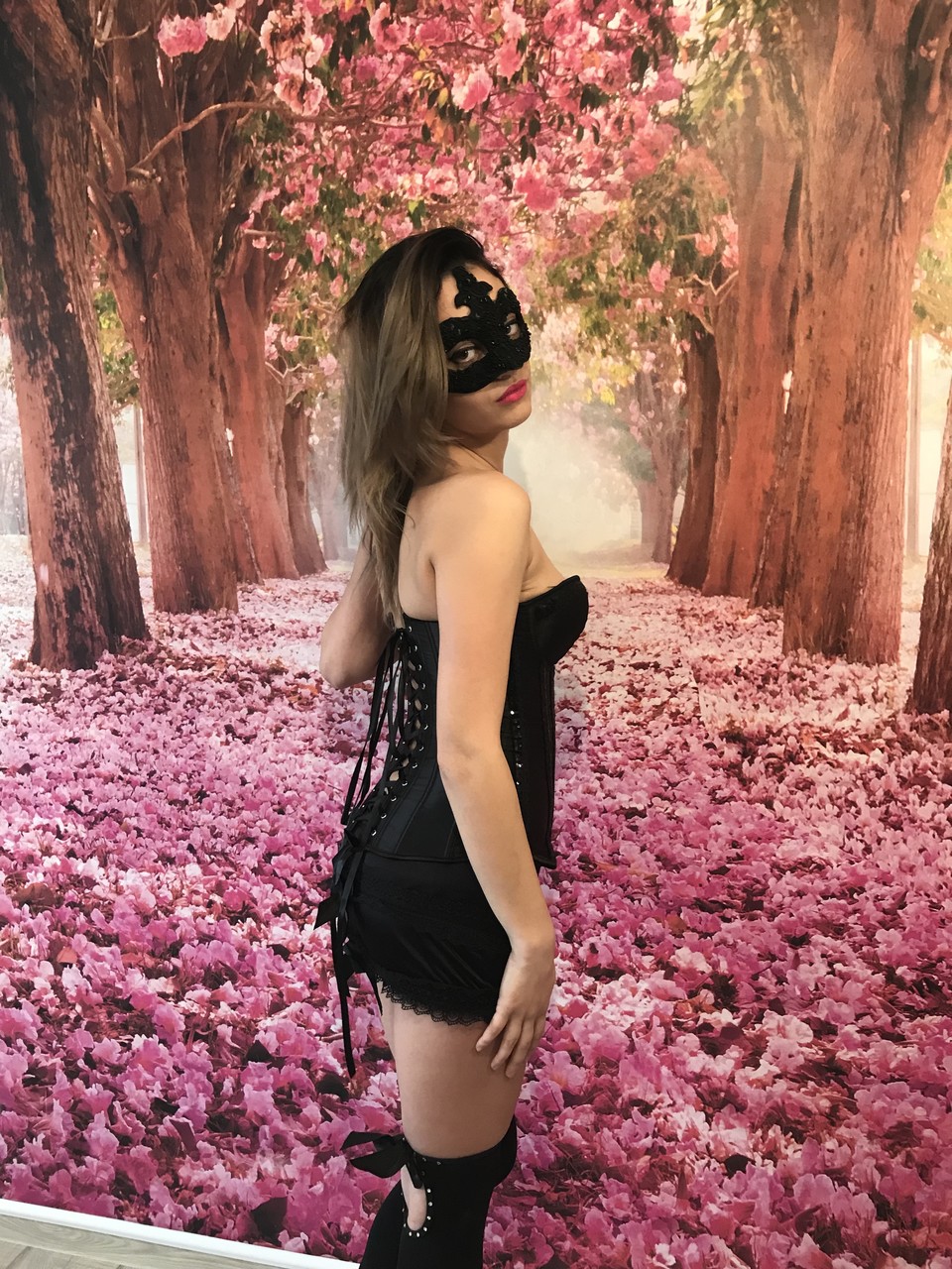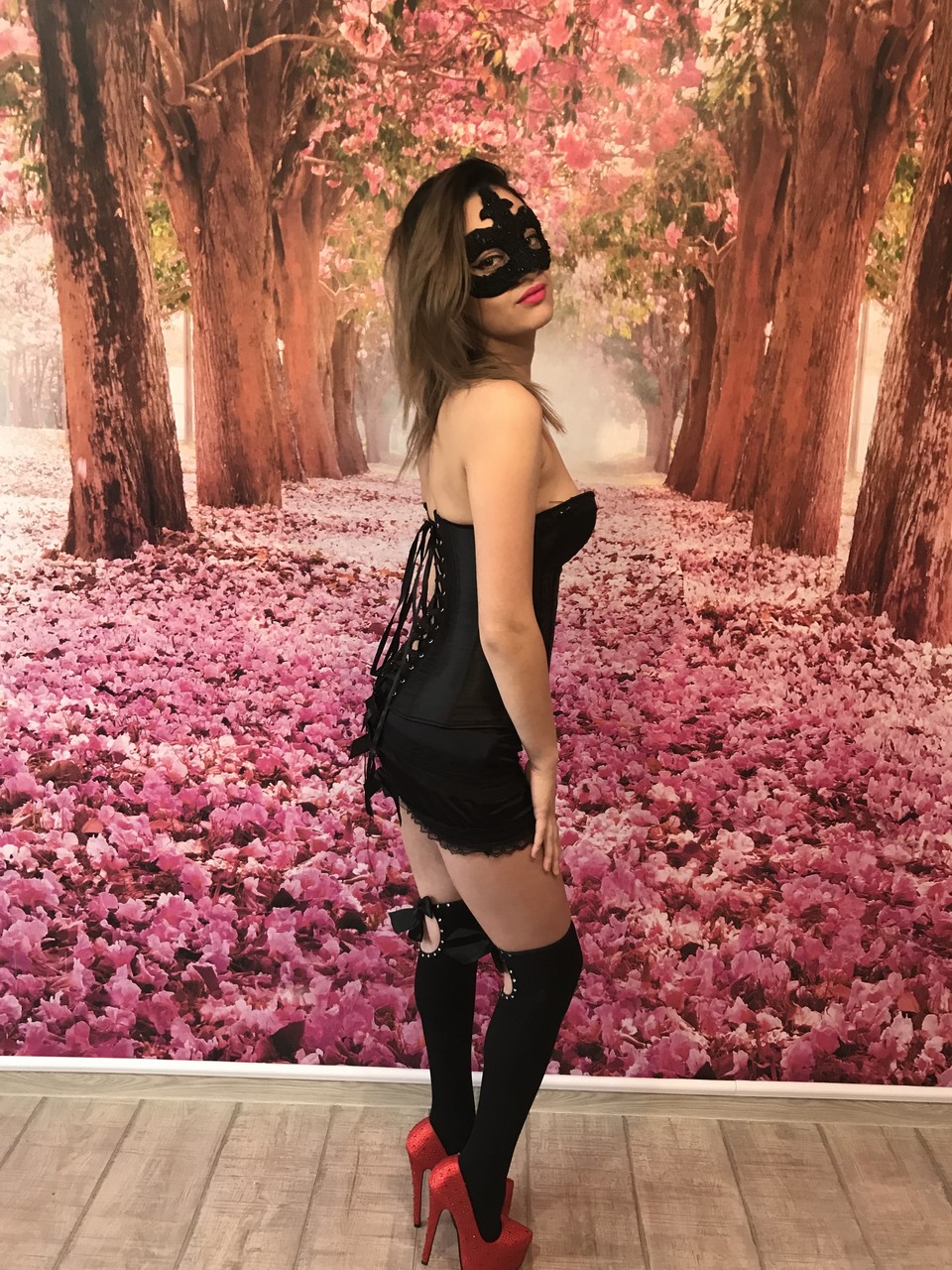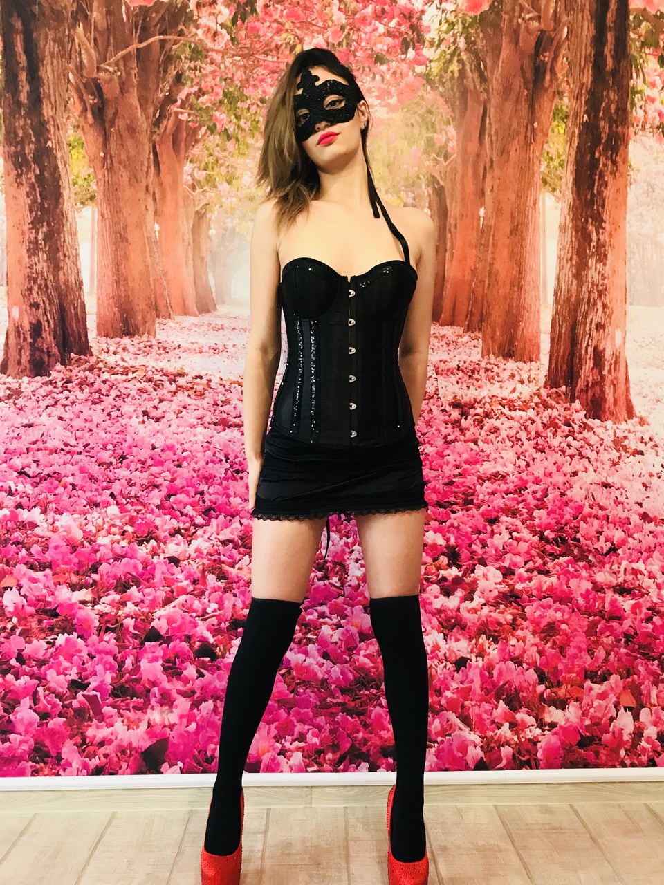 蒙面业余模特Katherine2Hot穿黑色连衣裙挑逗,脱至内衣和少女袜——可爱、性感、完美的恋物宝贝,准备好取悦你。