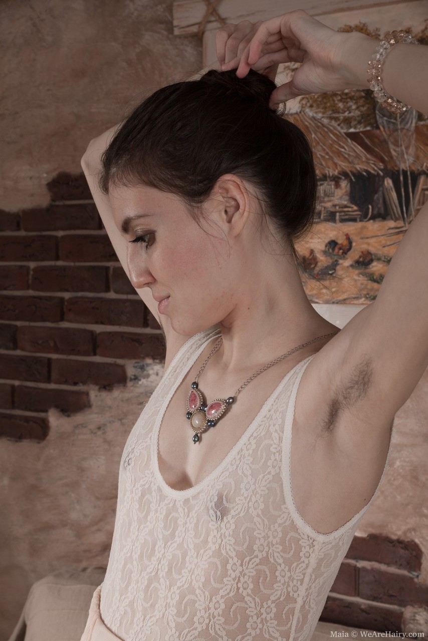 大眼睛的业余爱好者Maia摆姿势瘦弱的身体以揭示特写毛茸茸的阴道