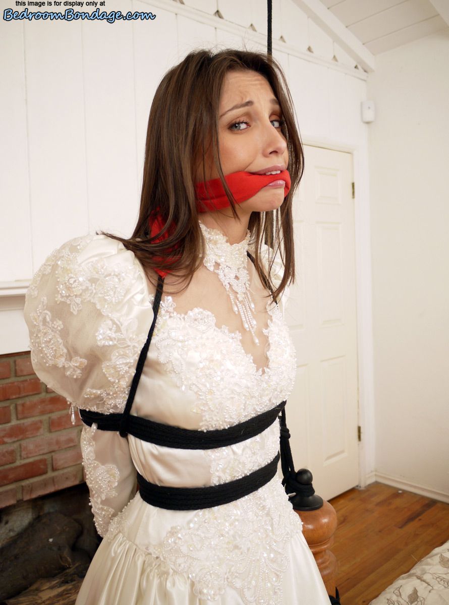 被捆绑的黑发新娘塞莱斯特·斯塔尔穿着婚纱球塞口
