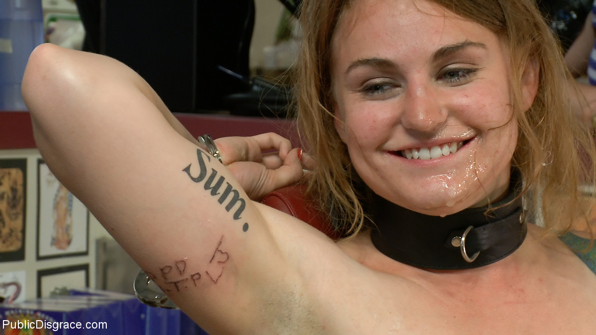 红发佩顿·贝尔在公开BDSM表演中被汤米·皮斯托尔捆绑并颜射。戴着项圈的娇小顺从者在户外硬核束缚秀中脸上被射。