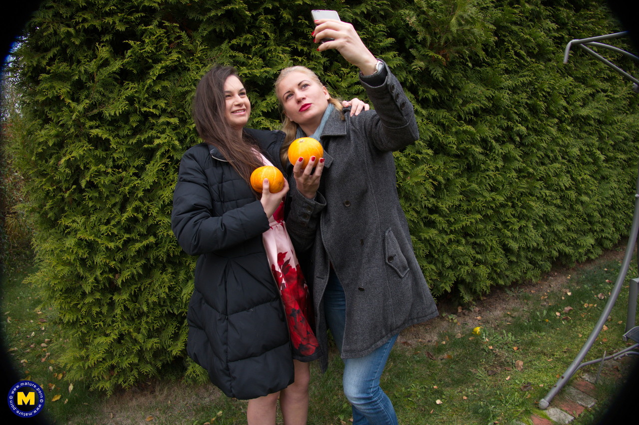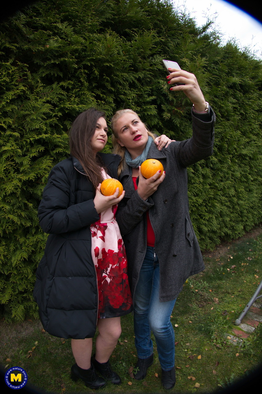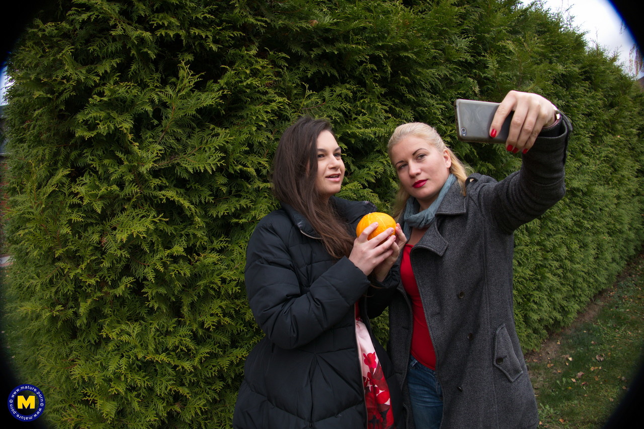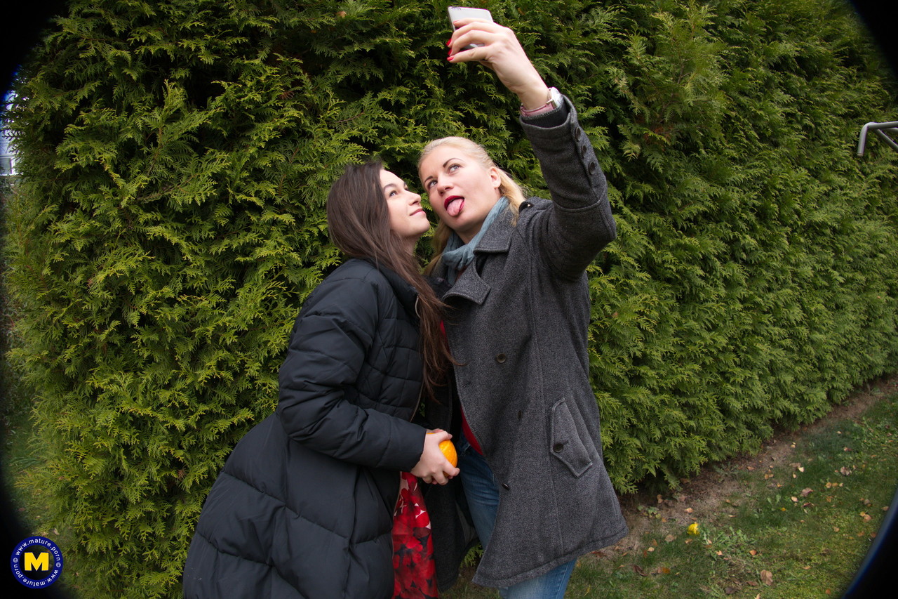 成熟女同性恋卡莉娜和波莉娜在户外自拍时摆姿势