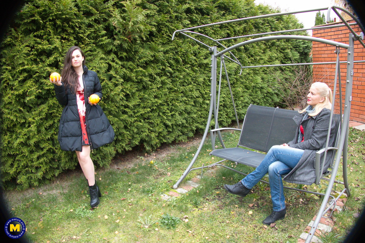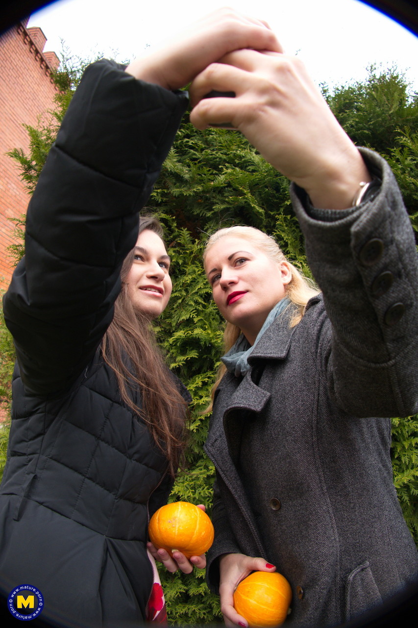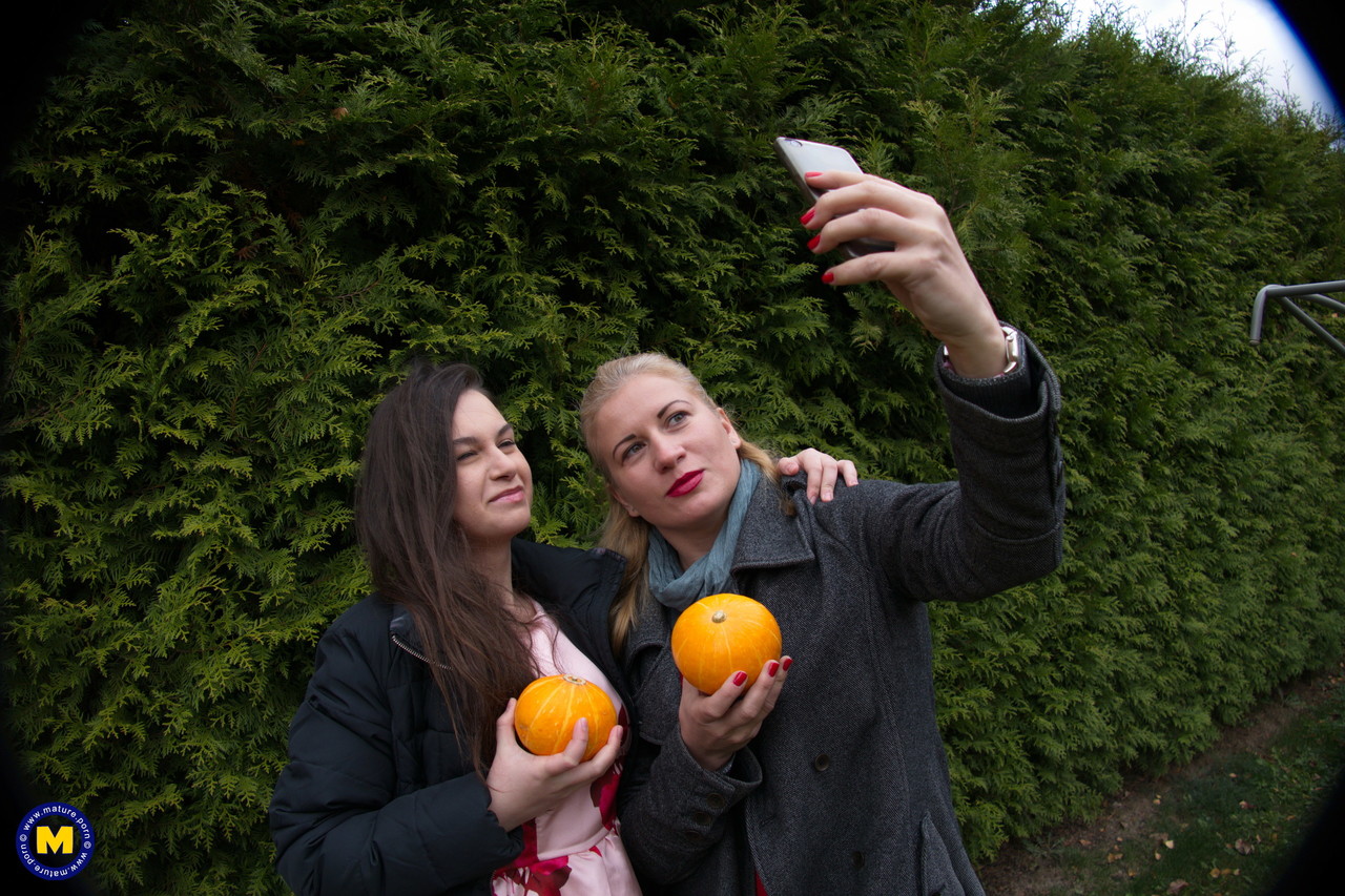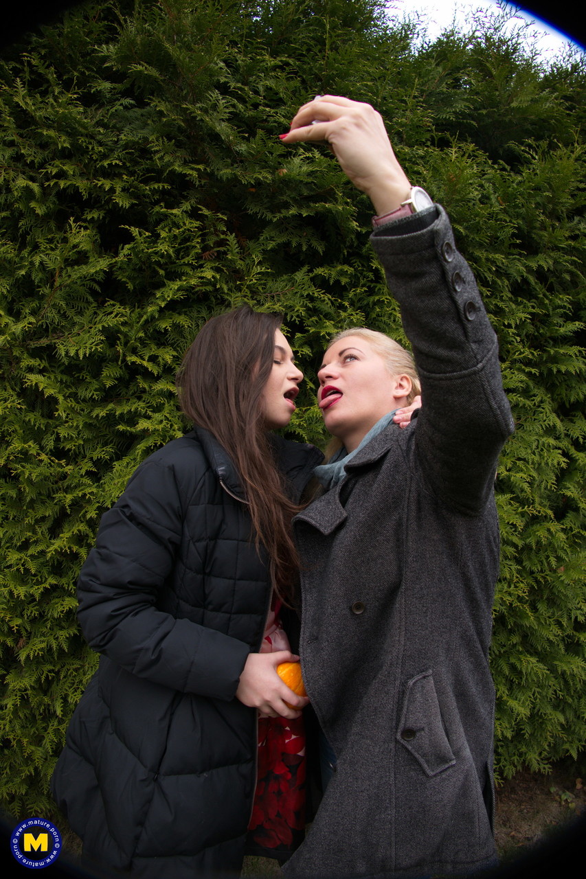 成熟女同性恋卡莉娜和波莉娜在户外自拍时摆姿势