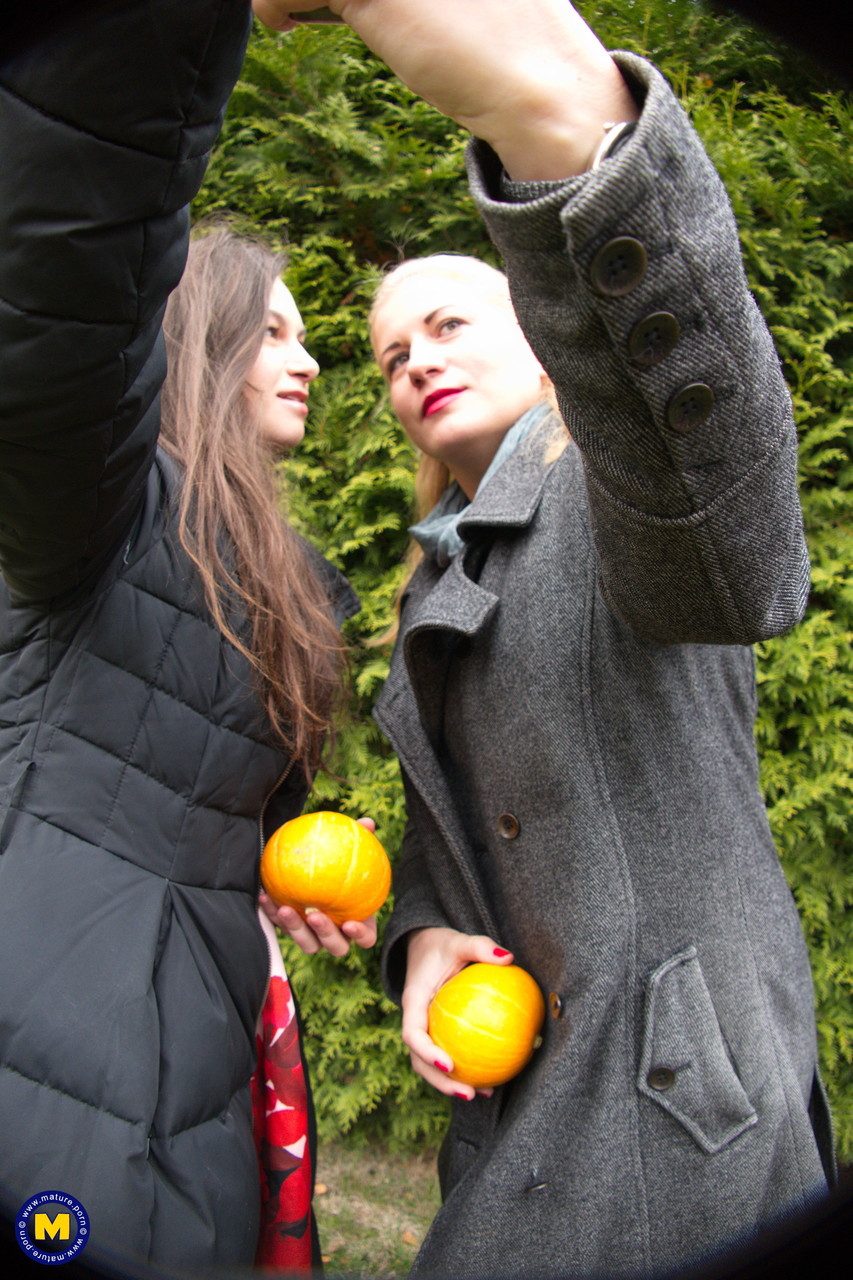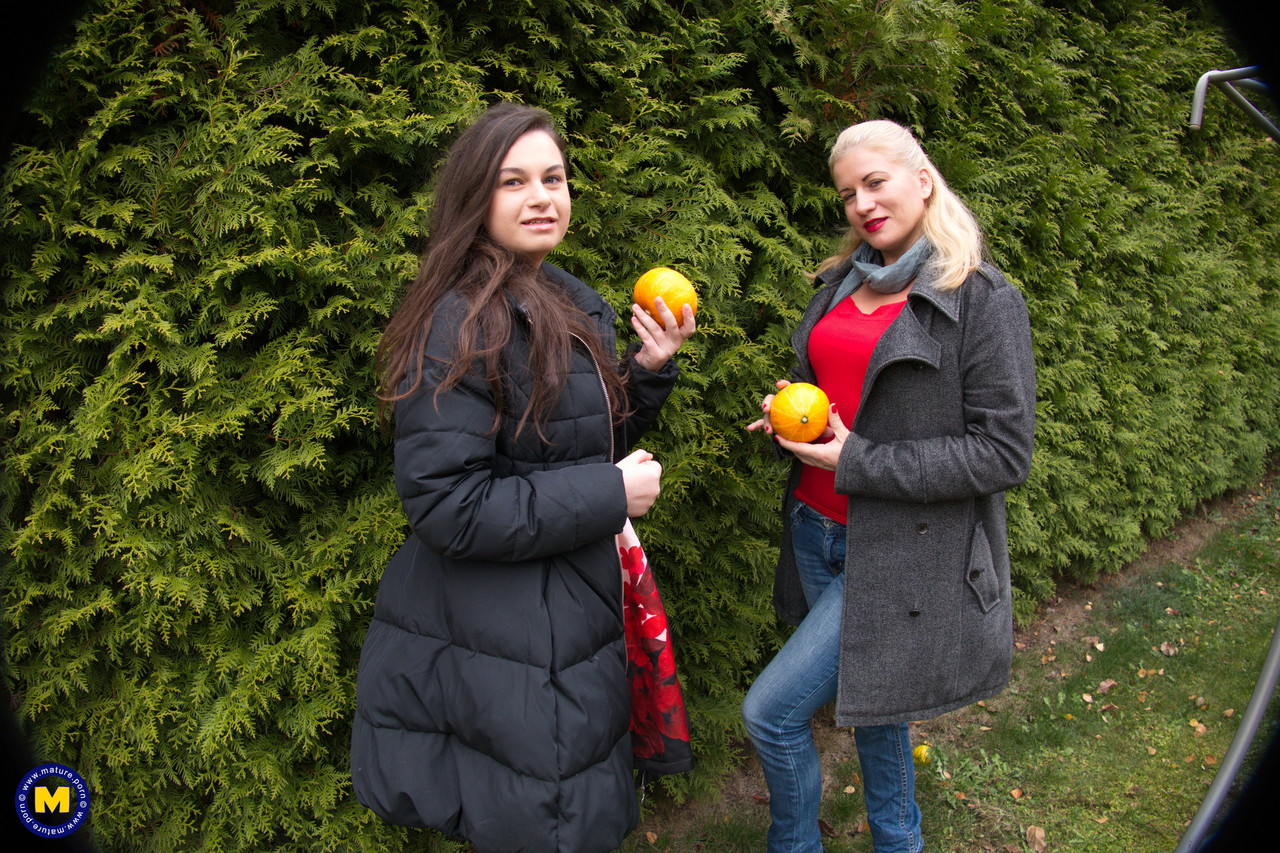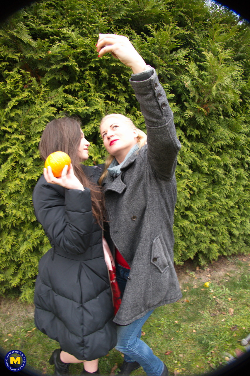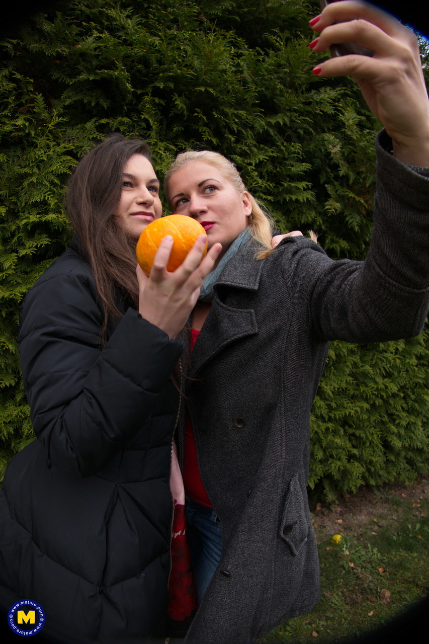 成熟女同性恋卡莉娜和波莉娜在户外自拍时摆姿势