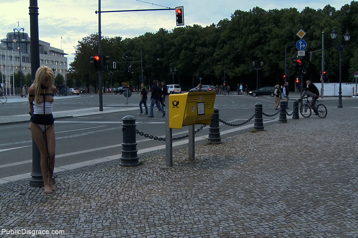 Blanche 和 Zenza Raggi 被捆绑、剥光并在户外 BDSM 画廊中公开羞辱 — 金发与黑发,阴部暴露。