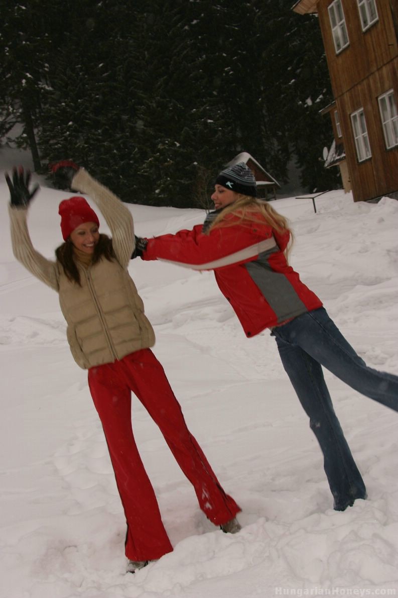 女同性恋者Renata Tomankova和她的女友在雪中舔阴 - 图库信息