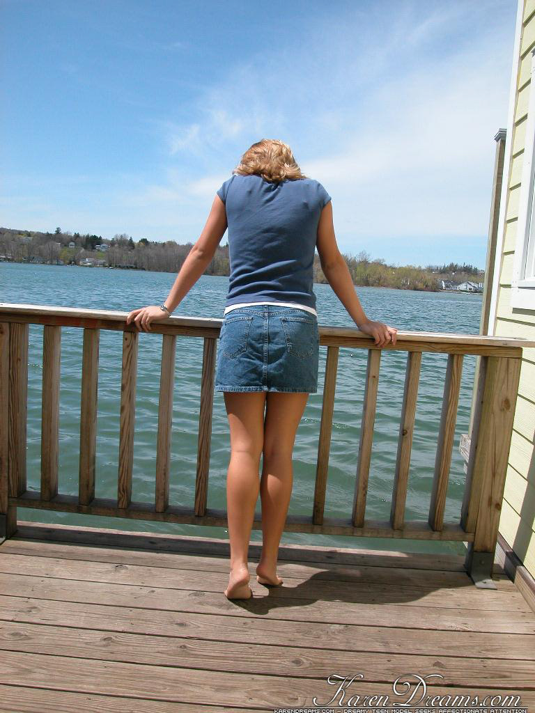 可爱的青少年凯伦在码头上裙子被掀起来,露出内穿的棉质内裤。 业余爱好者女孩张开双腿,展示透明的内裤,裙子被掀起来,露出屁股和脚。