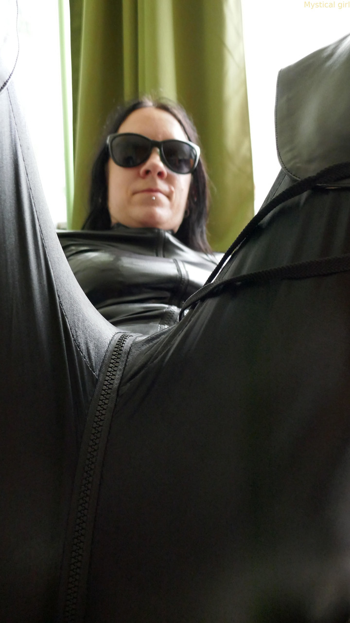 黑发业余模特穿皮革连体衣戴太阳镜 - 图库信息