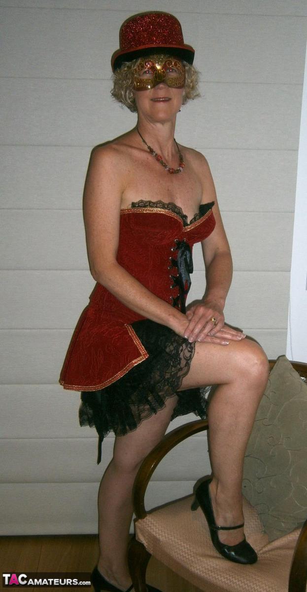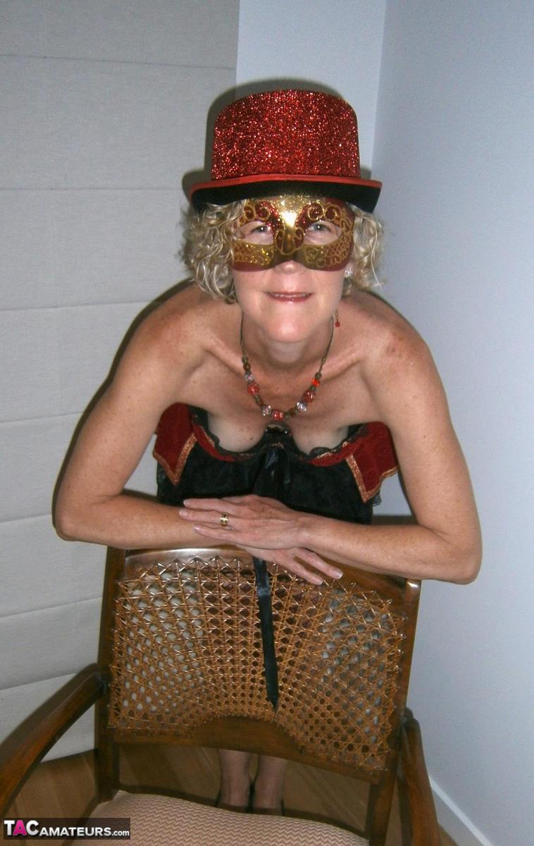 杰奎琳,年长金发女性,戴着古怪帽子和化装面具脱衣