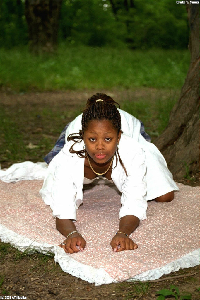 漂亮的黑人少女Lorna在户外展示她的乳房和修剪的阴道 - 图库信息