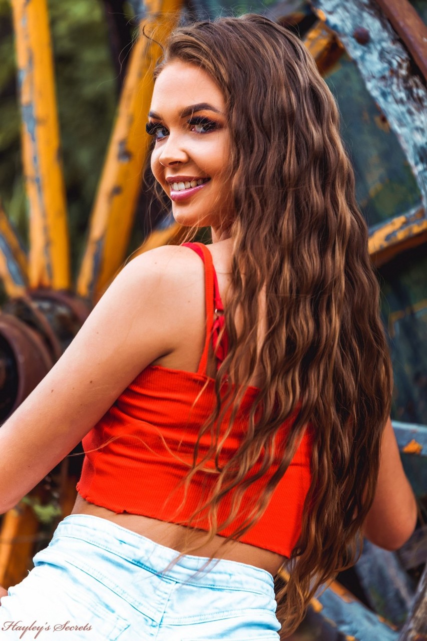 性感女郎塔拉·金穿着比基尼挑逗,展示她美丽的臀部,旁边是户外的古董铸铁马车轮。