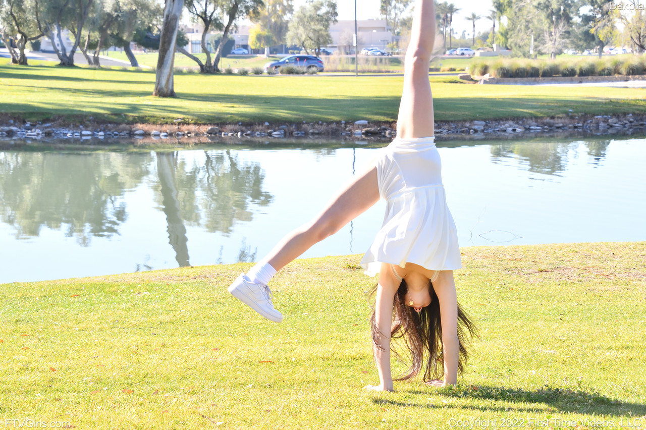 新手达科塔在河边的户外挑逗中展示了她小巧的自然乳房和柔韧的身体,抬起她的裙子,没有内裤,进行柔性单人刺激。