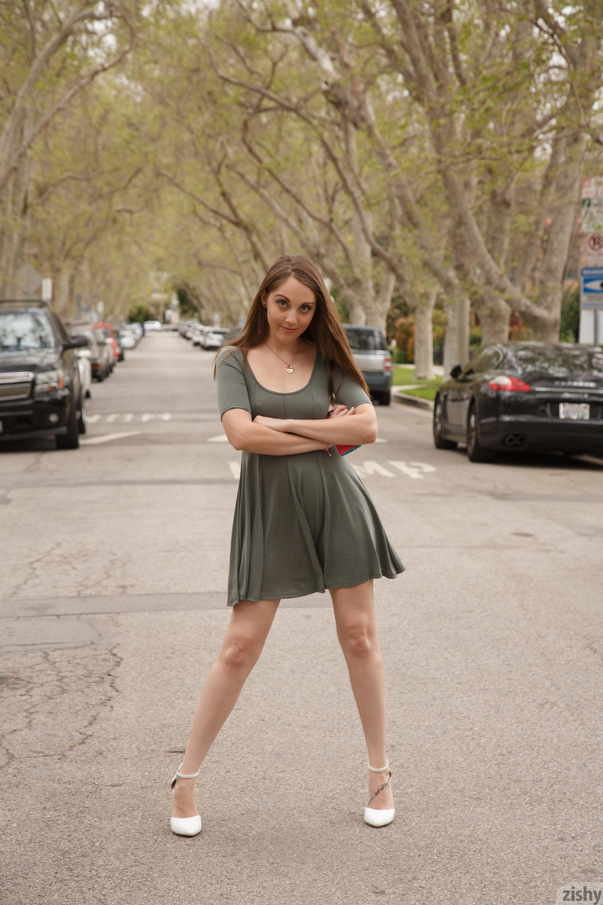 顽皮的棕发女郎Nickey Huntsman在公共场合露胸露臀 - 图库信息