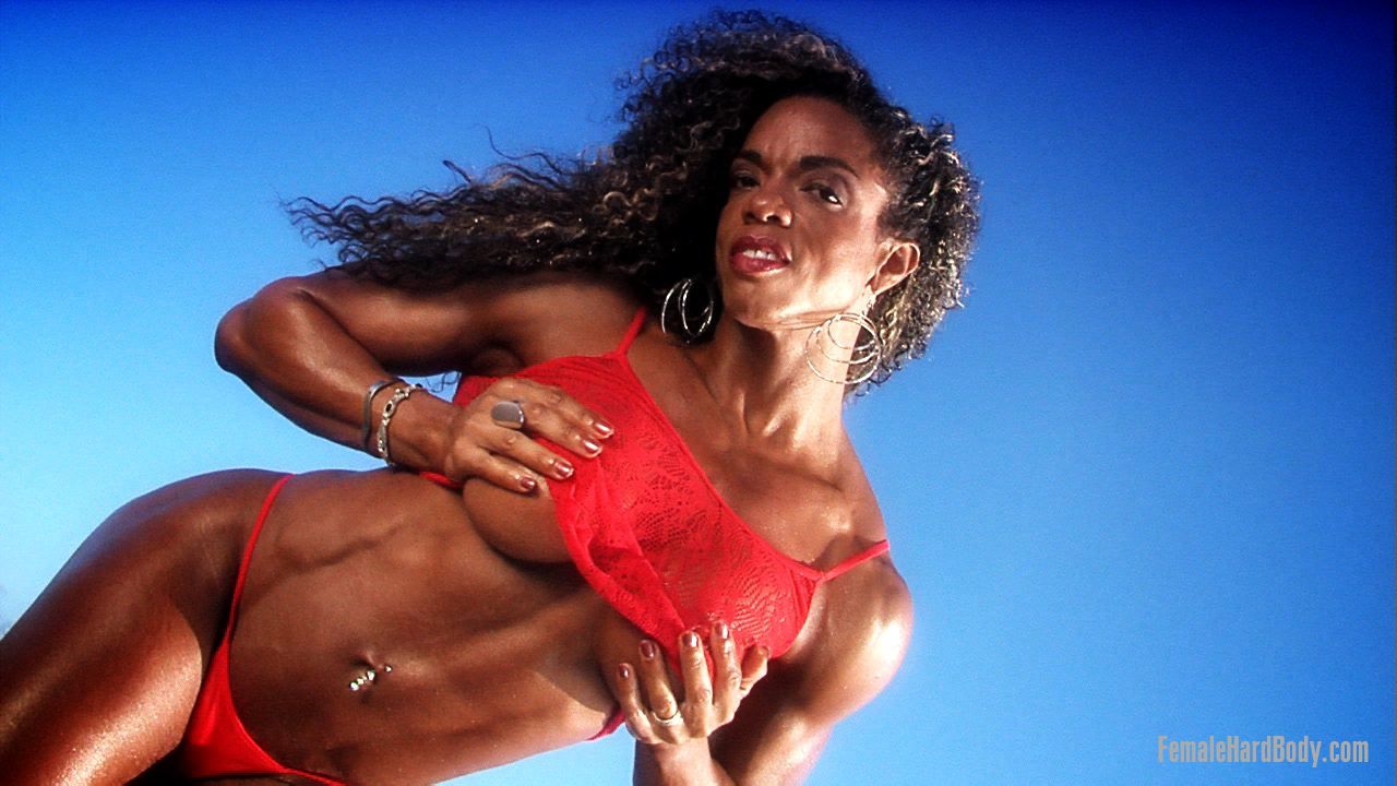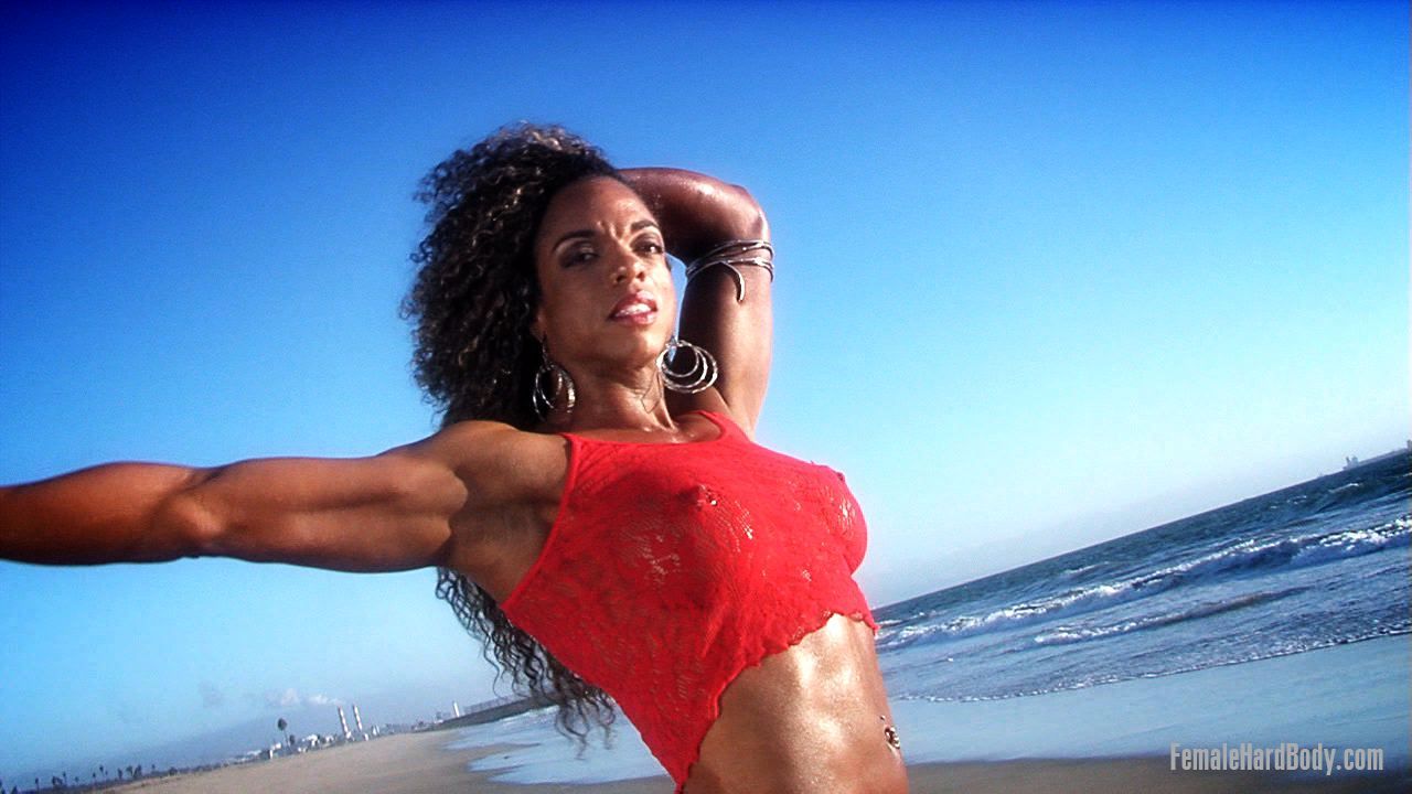 海滩健美运动员亚历克西斯·埃利斯展示穿孔腹部和性感臀部