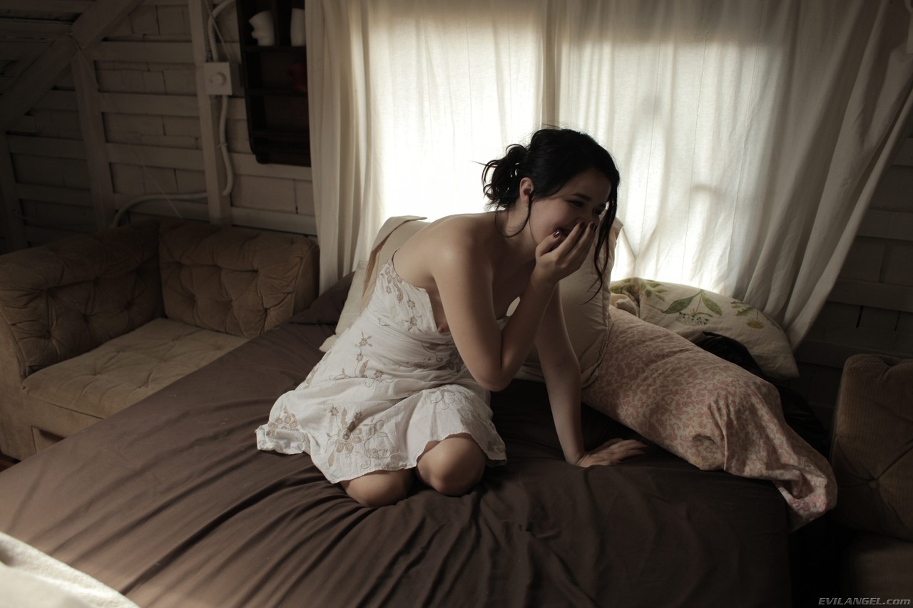 Yhivi 是 一位 黑发 美女, 在 床上 张开 自己 的 毛发 浓密 的 阴道