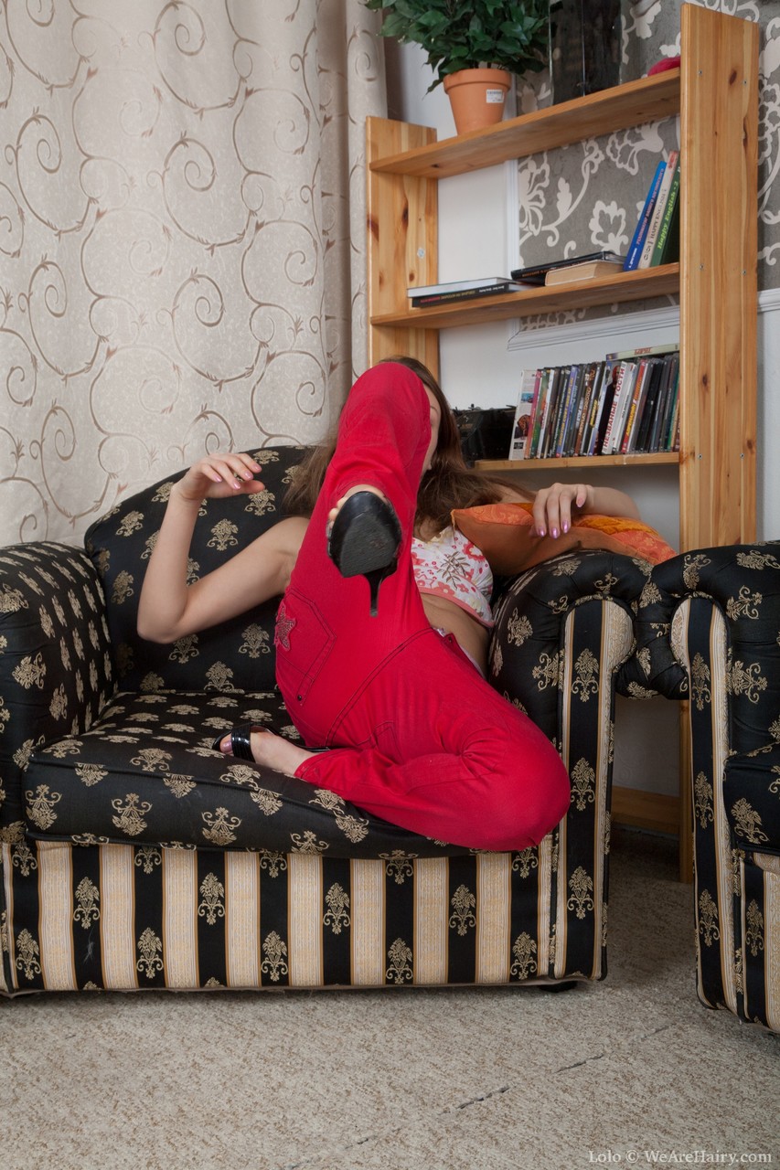 高挑棕发女郎洛洛在扶手椅中脱衣,自豪地展示她浓密天然的下体毛发,献给业余毛控爱好者。