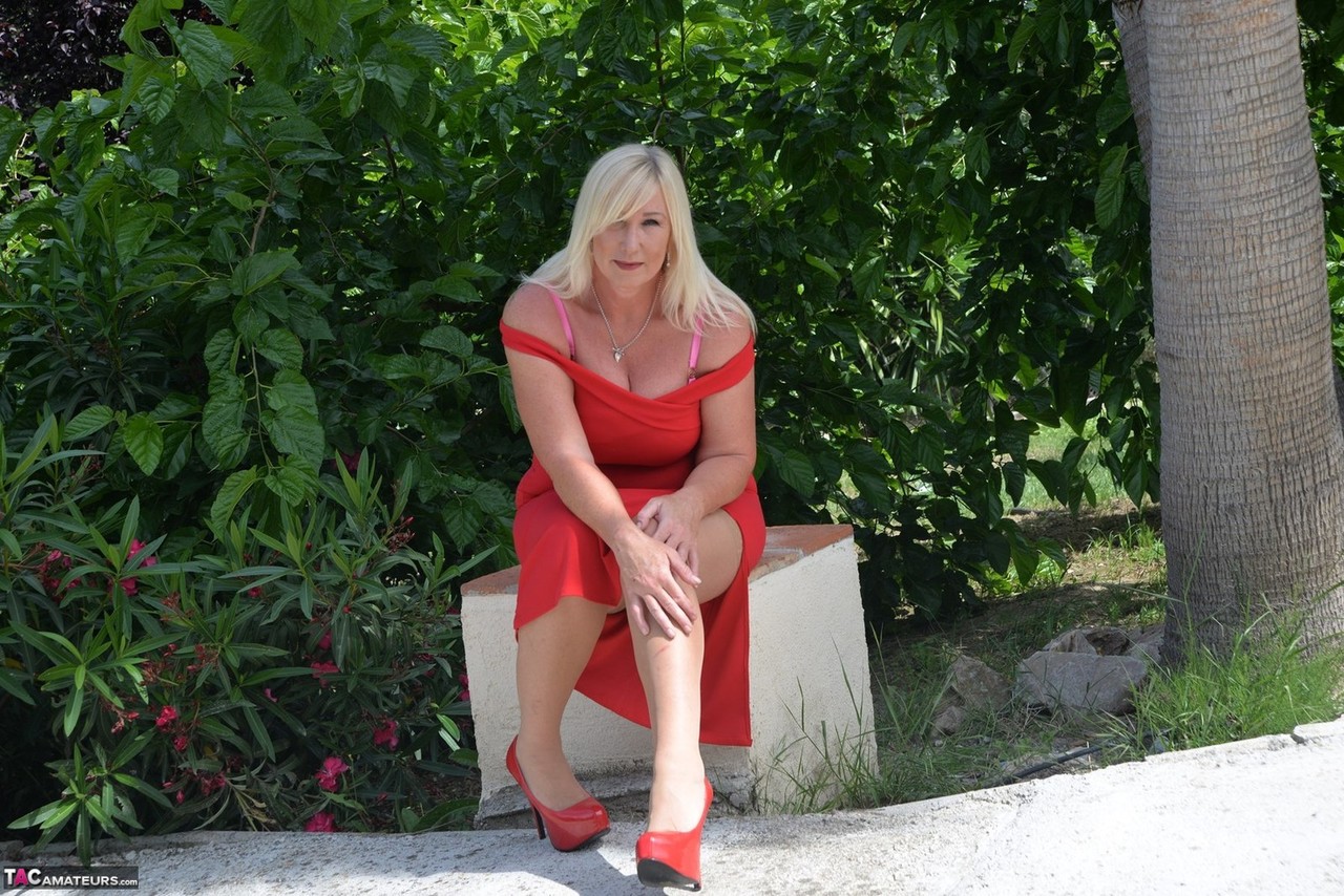 金发熟女梅洛迪穿红色连衣裙展示大胸部和大屁股 - 图库信息