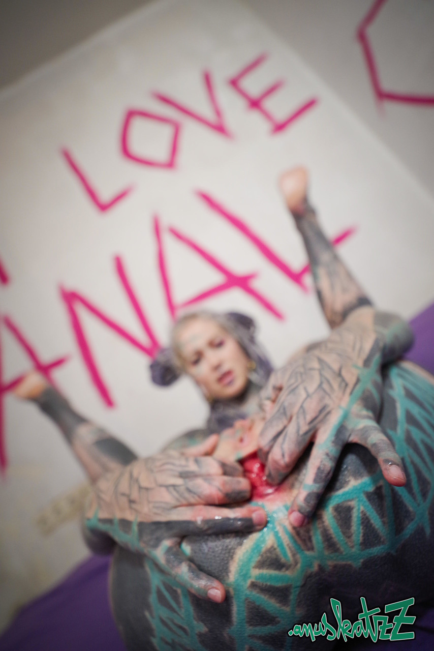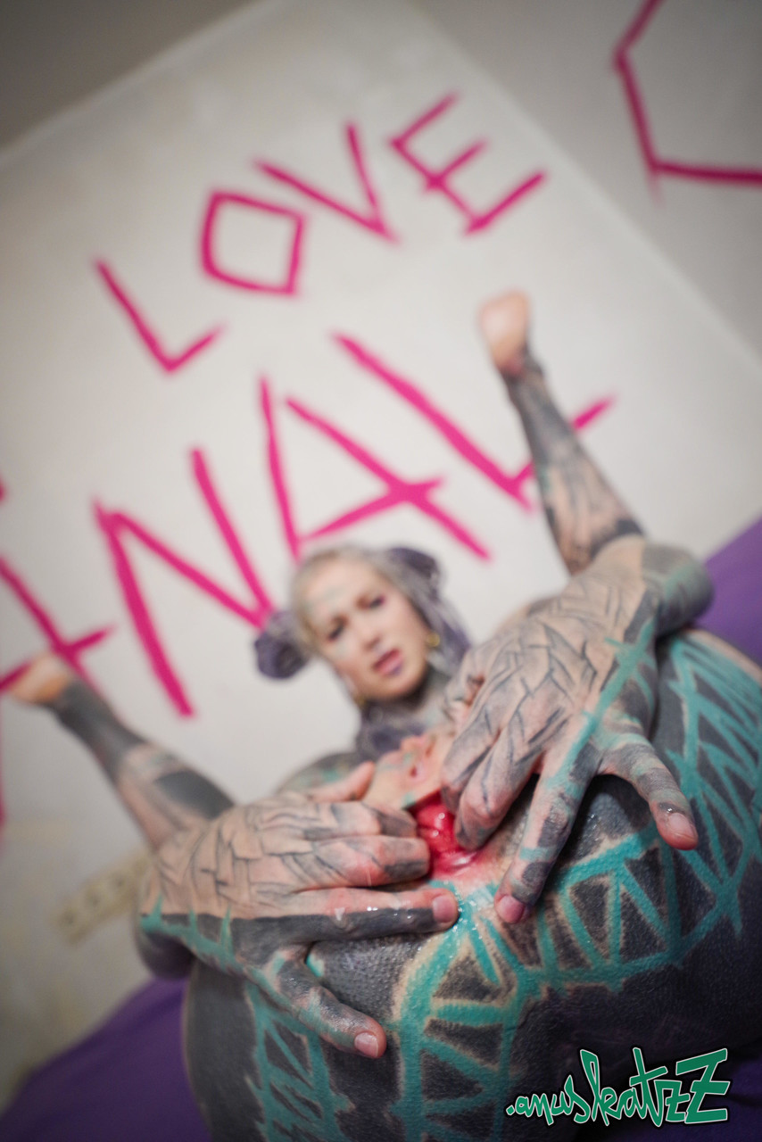 纹身女孩莉莉·露用假阳具并在肛交前张开她的肛门 - 图库信息