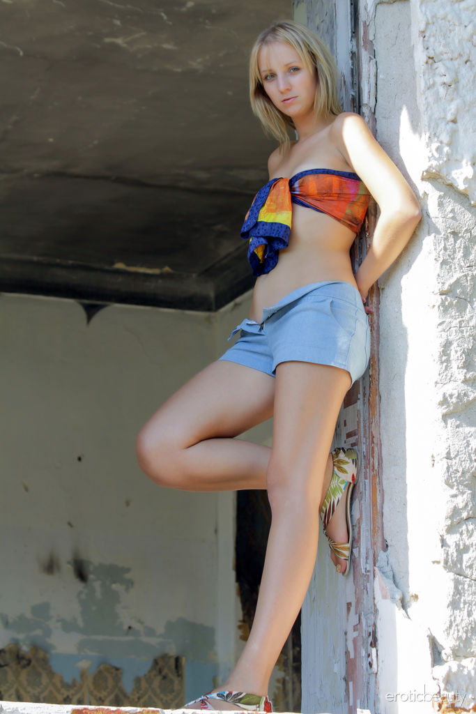 金发少女伊洛娜D在废墟中脱掉吊带背心和短裤全裸
